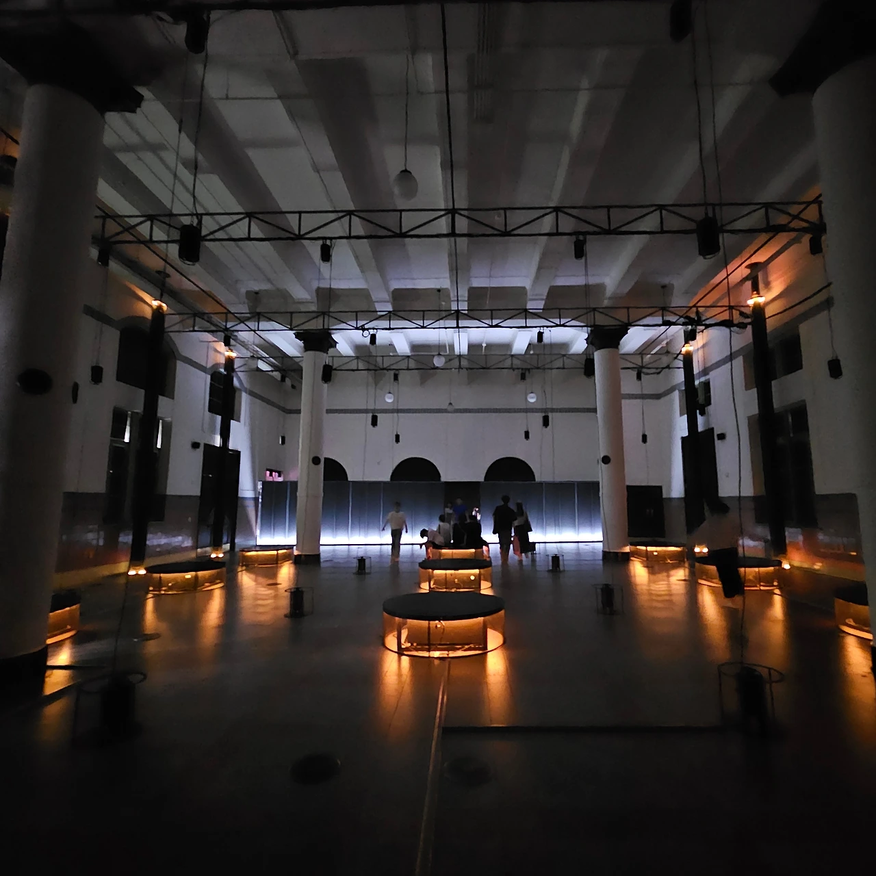 독일의 MONOM이 선보이는 "IMAGINED WORLDS"는 48개의 전방향 스피커와 9개의 서브우퍼로 구성된 4DSOUND 시스템을 통해 관람객을 마치 심해 속으로 데려가는 듯한 경험을 선사합니다. 사방에서 들려오는 다양한 소리들, 특히 고래의 울음소리로 추정되는 고주파 음들은 깊은 바닷속 미지의 세계를 상상하게 만듭니다. 공간 끝에 설치된 거울은 이 신비로운 경험을 더욱 확장시켜 줍니다.