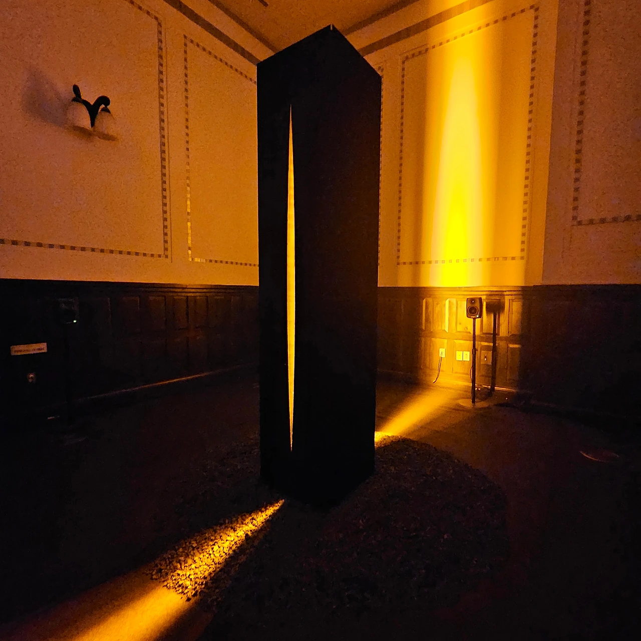 디스트릭트의 "ECHO"는 검은 직육면체와 그 주변에 깔린 작은 돌들로 구성되어 있습니다. 직육면체의 틈새로 보이는 오렌지빛은 강약을 반복하며 마치 생명체의 숨결처럼 느껴집니다. 이 작품은 우주의 신비로움을 연상케 하며 깊은 사색에 빠지게 만듭니다.