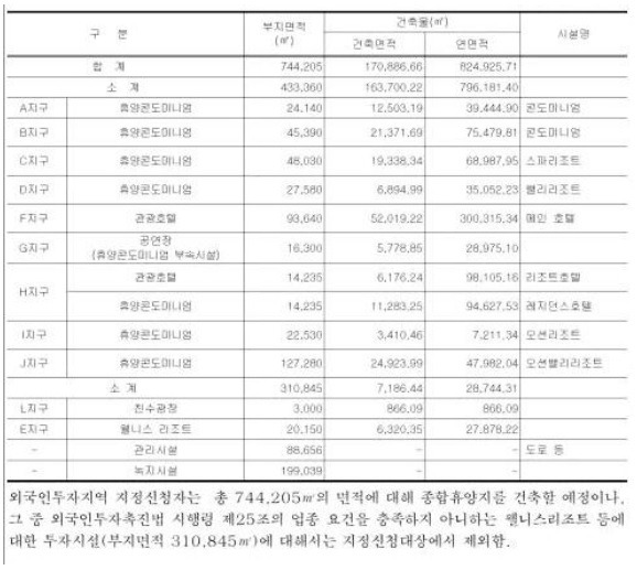 1) 목적 - 의료, 보양, 주거, 호텔, 카지노 컨벤션등의 기능이 갖추어진 휴양형 주거단지 개발.(1차종합계획 골프장 포함, 2차종합계획 카지노포함, 골프장 제외)