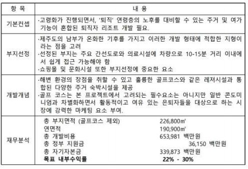 - Jones Lang LaSalle 보고서(국제자유도시 지정을 위한 용역보고서)내 5대 촉매프로젝트의 하나인 휴양형 주거단지 프로젝트 제안.