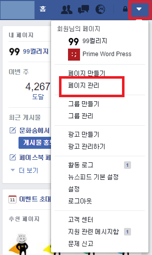 - 페이지의 오른쪽 상단의 화살표를 클릭하고 [페이지 관리]를 선택