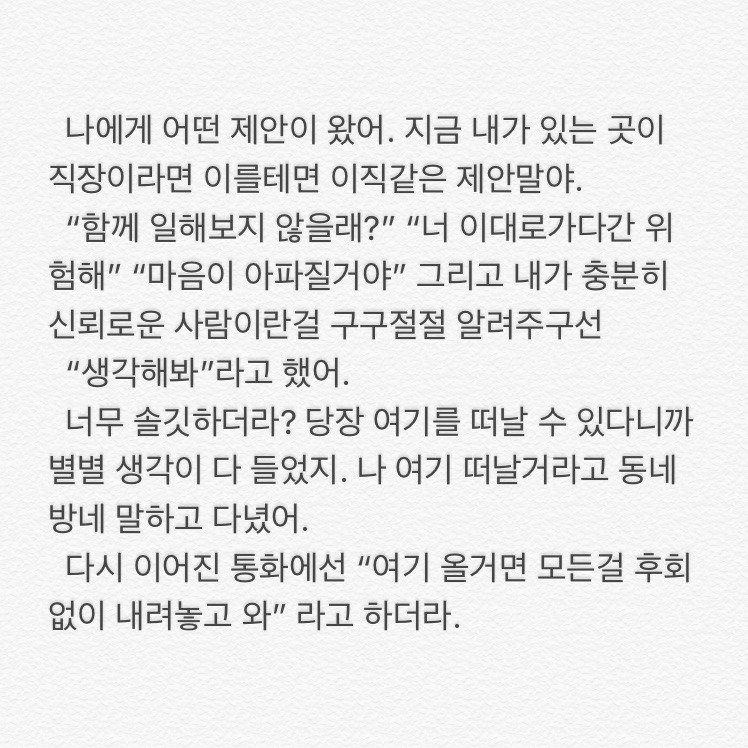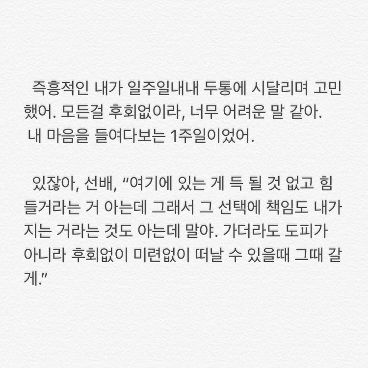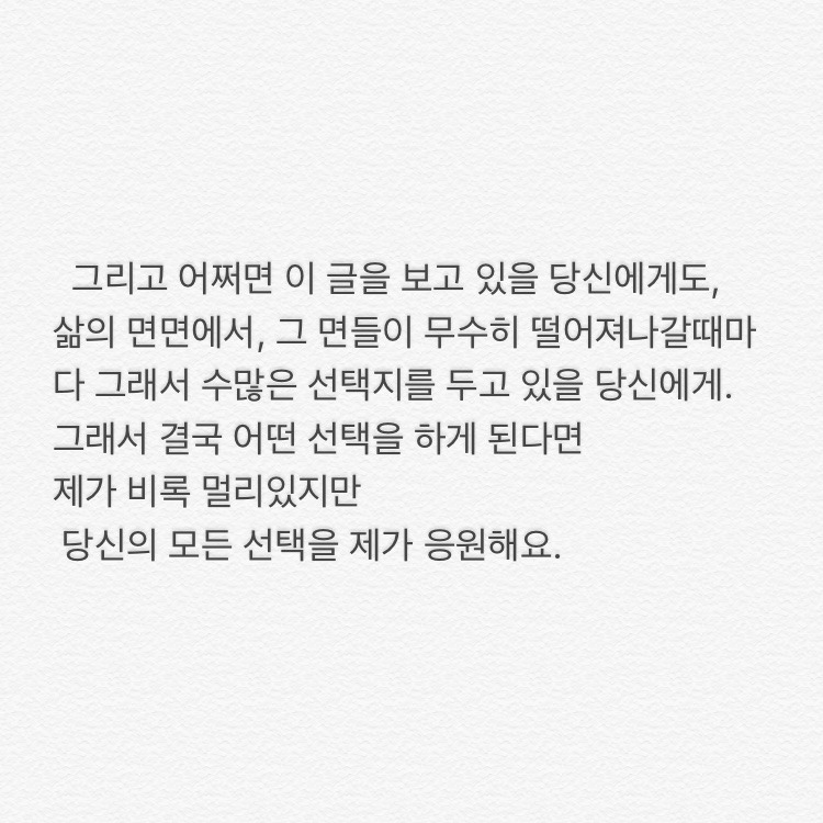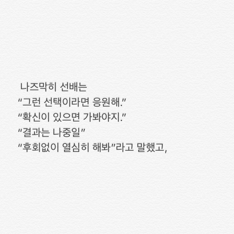 ㅁ한달이 지난 시점에서 묵혀둔 이 글을 올리는 이유는 오늘 또 저를 응원해줄 사람을 만났기 때문이고, 그래서 다시 기운 내고 싶어서, ㅁ그리고 이 글을 읽는 당신도 힘이 났으면 해서.p.s 후에 선배는 목이 쉰 채로 전화와 잘지내고 있다고 했다. 멋있다 정말
