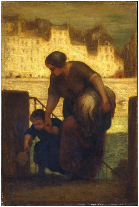 오노레 도미에는 회화를 통해 도시 빈민의 일상을 진지하게 묘사한 작가다. 동시대 대표적 사실주의 화가 밀레와 쿠르베처럼 당대 현실을 비판적으로 바라보는 한편 충만한 휴머니티를 추구했다. ‘세탁부’에 표현된 모녀는 이목구비가 뚜렷하지 않다. 자기의 얼굴을 잃은 대신 여성 노동자, 즉 세탁부로 존재한다. 계단을 혼자 올라가기 힘겨운 아이는 엄마 손을 잡고 있다. 마지막 계단이라는 점은 유일한 위안이다.