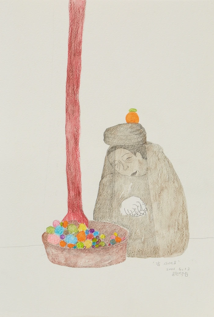 2024년 학고재에서는 윤석남 & 윤석구 남매 작가 2인전이 있었다. 윤석남은 ‘드로잉’으로 일가를 이룬 작가다. 윤석남은 작업에 대한 고민을 풀어내거나 ‘그리기’에 대한 욕구를 해소하기 위해 일정한 크기의 종이에 색연필과 연필을 이용해 수많은 드로잉을 남겼다. 순간적으로 떠오르는 이야기나 형상을 즉흥적으로 그리고 글귀를 써넣은 윤석남의 드로잉은 작가의 일상을 기록한 그림일기를 연상시킨다.