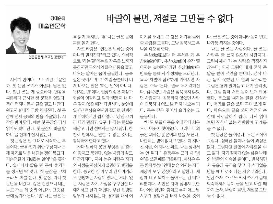 첫 문장은 늘 어렵다. 모든 시작이 그렇다. 정해진 틀이나 풀이 과정은 없다. 그렇다고 한없이 자유로울 수도 없다. 자기 절제가 없는 삶은 나태와 방종의 연속일 뿐이다. 반복하면서 규율과 규칙을 찾고 내 스타일을 만들 때 비로소 나는 자유로워진다. 일단 쓰자. 쓰고 또 써서 쓰기가 몸에 익숙해져서 몸이 글을 밀고 나갈 때까지 쓰자. 바람이 불면, 저절로 그만둘 수 없다.