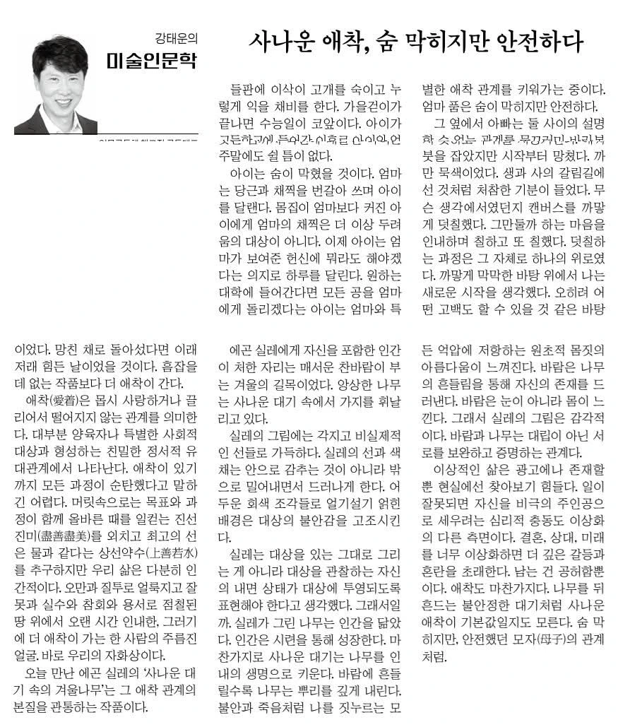 오늘 만난 에곤 실레의 <사나운 대기 속의 겨울나무>는 그 애착 관계의 본질을 관통하는 작품이다. 에곤 실레에게 자신을 포함한 인간이 처한 자리는 매서운 찬 바람이 부는 겨울의 길목이었다. 앙상한 나무는 사나운 대기 속에서 가지를 휘날리고 있다. 실레의 그림에는 각지고 비실제적인 선들로 가득하다. 실레의 선과 색채는 안으로 감추는 것이 아니라 밖으로 밀어내면서 드러나게 한다. 어두운 회색 조각들로 얼기설기 얽힌 배경은 대상의 불안감을 고조시킨다. 실레는 대상을 있는 그대로 그리는 게 아니라, 대상을 관찰하는 자신의 내면 상태가 대상에 투영되도록 표현해야 한다고 생각했다. 그래서일까. 실레가 그린 나무는 인간을 닮았다.