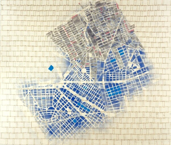 ‘파랑’은 격자 구조를 지도의 형식과 결합하여 추상회화를 도시적 서사의 장으로 확장한 ‘프로토-맵’ 연작에 속한다. 브래드포드는 엔드페이퍼를 겹겹이 덧붙인 표면 위에 파란색 스텐실로 지도 형태를 구현하고, 상단에는 흑백 신문지를 붙여 도시 구역을 형상화했다. 지도라는 시각언어를 통해 거리 위에 새겨진 역사, 이동성, 구조적 불평등을 탐색하며, 도시 구조와 지역 공동체에 대한 지속적인 탐구를 예고한다.