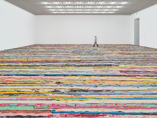 ‘떠오르다’는 이번 전시의 서막을 여는 작품으로, 관람객이 전시장에 들어서는 순간 가장 먼저 마주하게 되는 대형 설치 작업이다. 브래드포드는 로스앤젤레스 작업실 주변 거리에서 수집한 전단지, 광고 포스터, 신문지 등의 부산물들을 긴 띠의 형태로 재단하고 노끈으로 이어 붙여 전시장 바닥 전체를 덮는 회화적 설치물로 재구성하였다. 작가는 관람객이 작업 위를 걸을 수 있도록 하여, 작품을 ‘보는’ 감상을 넘어 ‘걷는’ 행위를 통해 신체적으로 경험하도록 유도한다. 작품을 밟고 지나가는 움직임에 따라 ‘떠오르다’의 표면은 미세하게 변형되며, 이러한 변화 자체는 작업의 일부로 남는다.