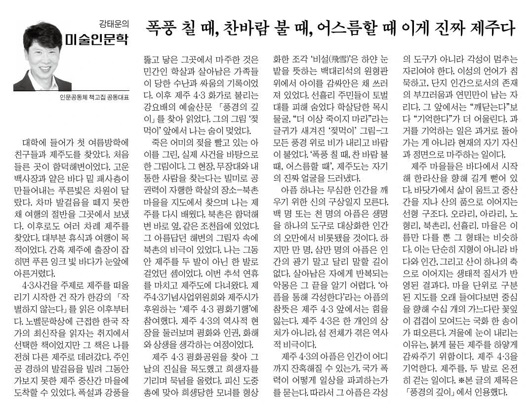제주 4·3의 아픔은 인간이 어디까지 잔혹해질 수 있는가, 국가 폭력이 어떻게 일상을 파괴하는가를 묻는다. 따라서 그 아픔은 각성의 도구가 아니라 각성이 멈추는 자리여야 한다. 이성의 언어가 침묵하고, 단지 인간으로서의 존재의 부끄러움과 연민만이 남는 자리다. 그 앞에서는 “깨닫는다”보다 “기억한다”가 더 어울린다. 과거를 기억하는 일은 과거로 돌아가는 게 아니라 현재의 자기 자신과 정면으로 마주하는 일이다.