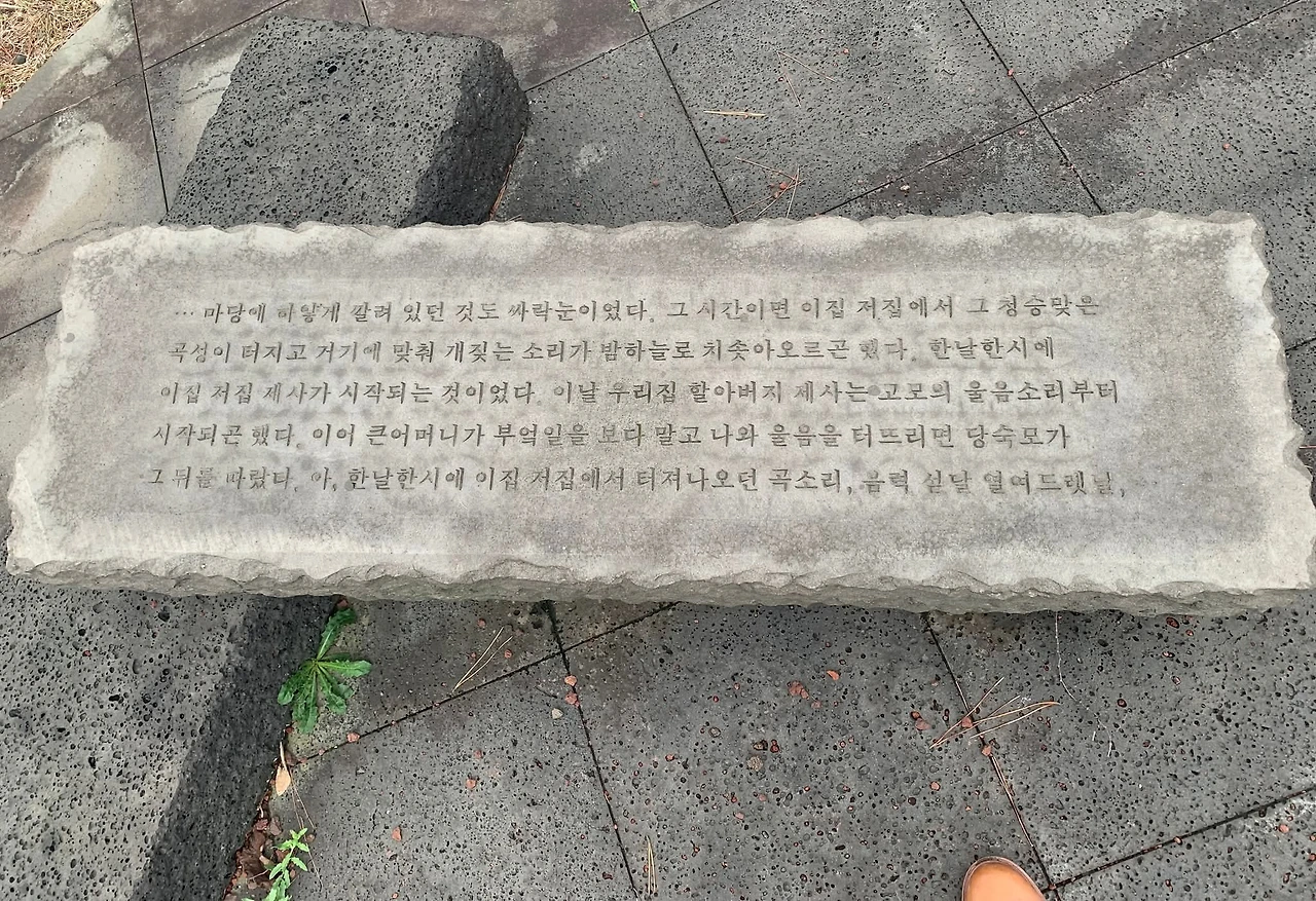 제주 4·3 평화공원을 찾아 그날의 진실을 목도했고 희생자를 기리며 묵념을 올렸다. 피신 도중 총에 맞아 희생당한 모녀를 형상화한 조각 「비설(飛雪)」은 하얀 눈밭을 뜻하는 백대리석의 원형판 위에서 아이를 감싸 안은 채 쓰러져 있었다. 선흘리 주민들이 토벌대를 피해 숨었다 학살당한 목시물굴, “더 이상 죽이지 마라”라는 글귀가 새겨진 「젖먹이」 그림-그 모든 풍경 위로 비가 내리고 바람이 불었다. ‘폭풍 칠 때, 찬 바람 불 때, 어스름할 때’, 제주도는 자기의 진짜 얼굴을 드러냈다.