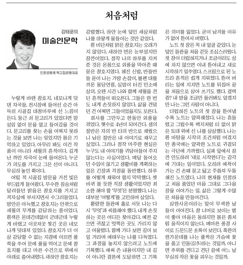 더럽혀진 노트의 첫 장을 뜯어낼수록, 노트는 얄팍해졌다. 나는 흔들렸고, 그럴수록 백지처럼 티 없이 맑은 토대 위에 선 나를 상상했다. 나는 흰 바탕을 시작의 조건처럼 여겼지만, 흠 없이 온전한 바탕을 갖추려는 태도는 종국에는 얄팍한 노트로 귀결되는 극단에 가까웠다. 실패 앞에서 잠깐 안도하려 ‘새로 시작한다’는 감각에 기대는 일이었다. 오히려 애착이 가는 건 손때 묻고, 닳고 주름져 두툼해진 노트였다. 나의 현재를 인정하고 처음 품었던 마음 그대로 그다음 장을 이어가는 일. 삶은 그렇게, 수많은 처음을 만들어간다.
