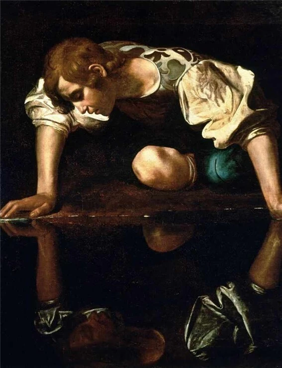 화가들에게 나르키소스는 자기애를 표현할 수 있는 좋은 소재입니다. 대부분의 화가들은 물에 비친 나르키소스를 아름답게 그렸습니다. 하지만 카라바조(Michelangelo Merisi da Caravaggio, 1573~1610)는 달랐습니다. 물에 비친 나르키소스 모습을 어둡고 추하게 그렸습니다.