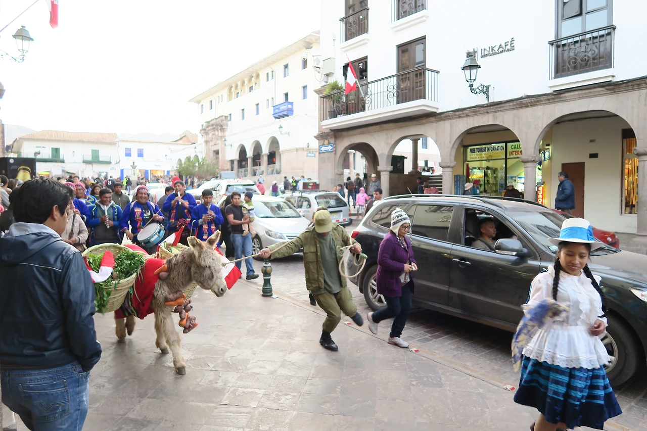 호스텔에 짐을 풀고, 미리 준비해둔 짜파게티를 한그릇 해치운 후 거리로 나섰다. 때마침 아르마스 광장 주변 길거리에서는 작으만 축제행렬이 이러지고 있었다. 군복을 입고 노새를 끌며 춤을 추는 이 남자의 몸짓에서 라티노의 흥과 열정이 물씬 풍겼다.