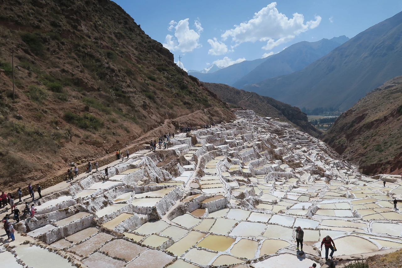 얼핏 보기엔 눈 내린 논밭처럼 보이는 이 것이 살리네라스 염전의 모습이다. 과거 이 곳이 바닷 속에 있던 시절, 소금으로 된 거대한 돌덩이인 암염이 만들어졌는데, 암염을 통과하는 지하수에 소금기가 섞여 나오면서 첩첩산중의 염전이라는 말도 안되는 장면을 만들어낸 것이다. 그야말로 자연의 신비와 그것을 절묘하게 이용한 잉카인의 지혜가 어우러진 작품이다.
