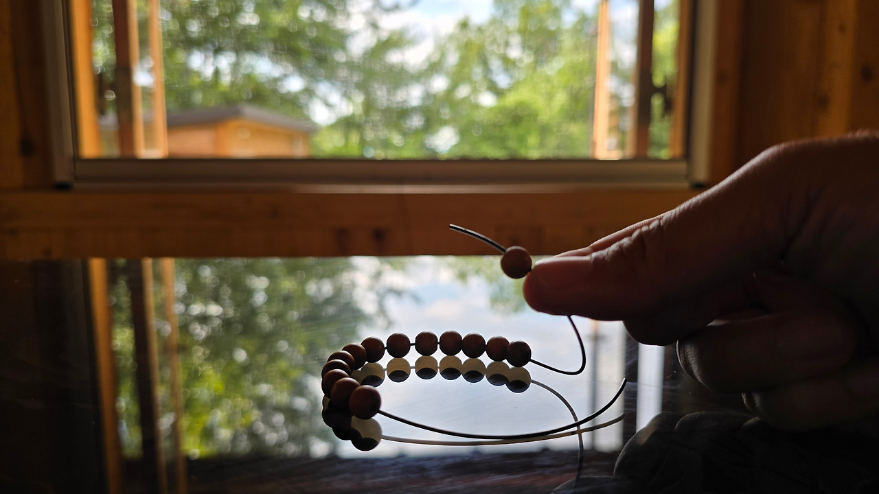 "여러분, 염주는 수행의 도구예요. 염불 할 때 횟수를 기억하는데 쓰이기도 하고, 염주 한알을 굴릴 때마다 번뇌를 끊어내는 것을 의미하고요. 염주의 가운데 뚫려있는 구멍은 번뇌의 근절을 나타내고, 하나의 실로 꿰는 것은 관세음부살의 자비를 나타내요. 염주알 개수는 108 번뇌를 나타내는 108개, 보살 수행 54 계위를 나타내는 54개 등 각 개수마다 의미가 있습니다만, 오늘은 개수보다는 자신의 손목에 맞게 알을 꿸 거예요."