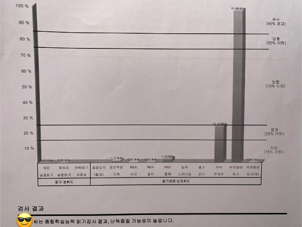 안내데스크 직원이 검사 결과가 나오면 불러주겠다며 조금만 기다리라고 했다. 검사 문항수가 많지 않아서 그런지 다른 검사와는 달리 당일에 결과가 나오는 모양이다. 그리고, 잠시 뒤 내 아들은 공식적으로 ‘난독’ 판정을 받았다. 이로써 내 아들은 그 유명한 ‘낫 놓고 기역 자도 모르는 자’가 된 것이다.