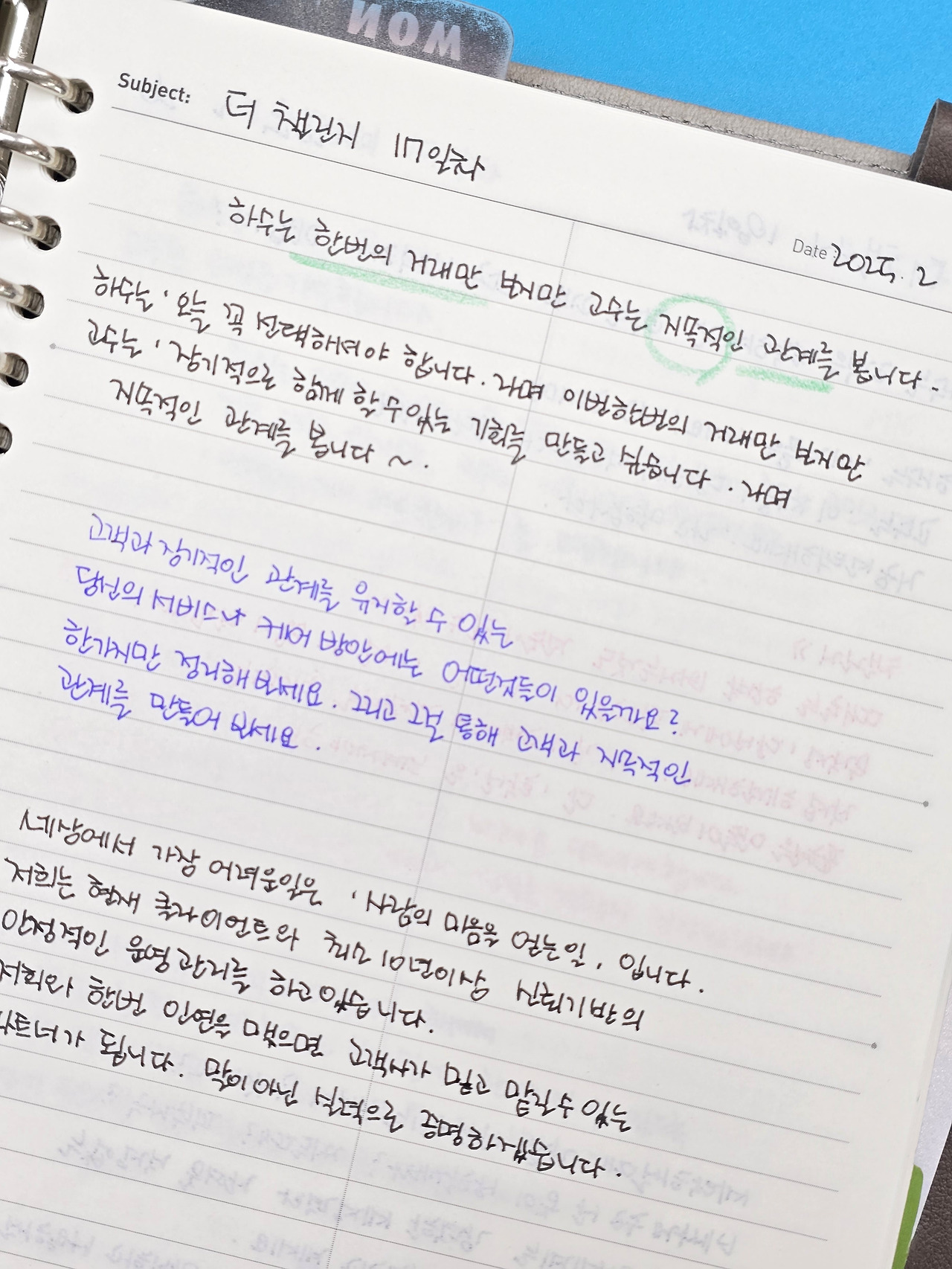 나는 미션을 받으면 쓰고 기록하고 또 생각해 본다. 물론 단톡에 인증을 하지만 그전에 먼저 노트에 그날의