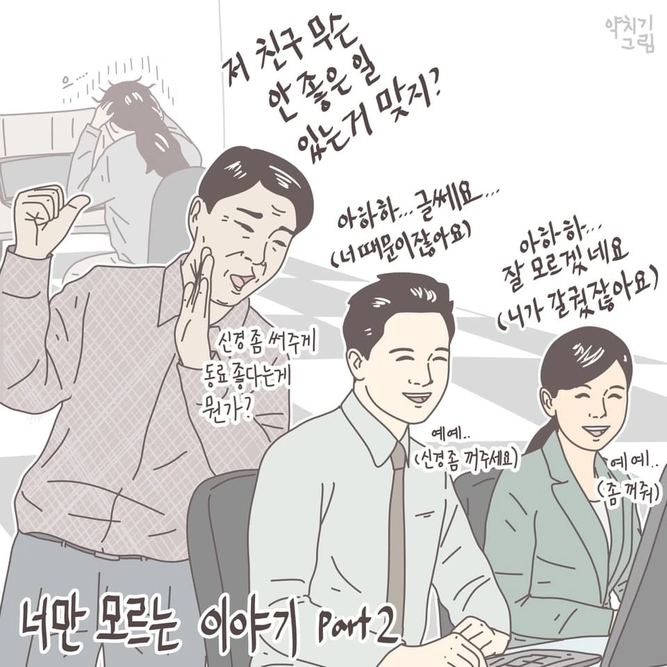 오늘도 출근시간에 맞춰 겨우 출근한 김 차장님이 기분 나쁘게 실실 웃으며 실없는 농담을 건넨다.