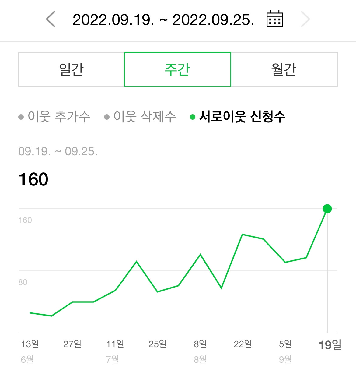 지난주에만 160분이 내가 운영 중인 네이버 블로그에 서로 이웃 신청을 해 주었다.