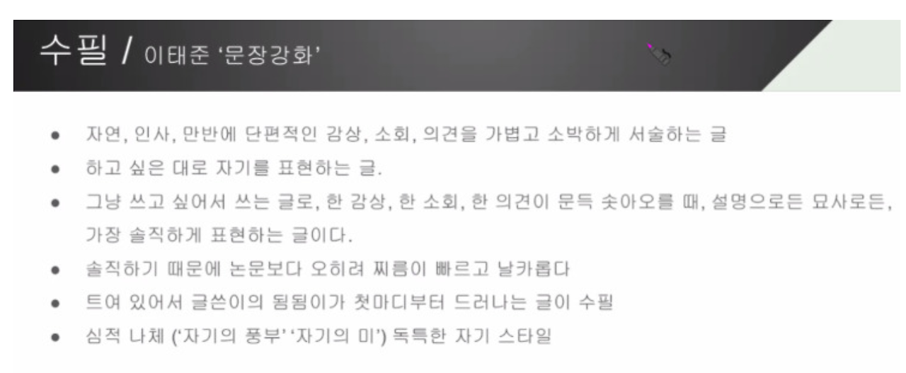 아... 정말 멋진 말이었다. 멍충이! 나는 왜 이런 생각을 못할까! 강사님은 이태준 작가님의 『문장 강화』 중 수필에 관한 글을 보여주셨다.