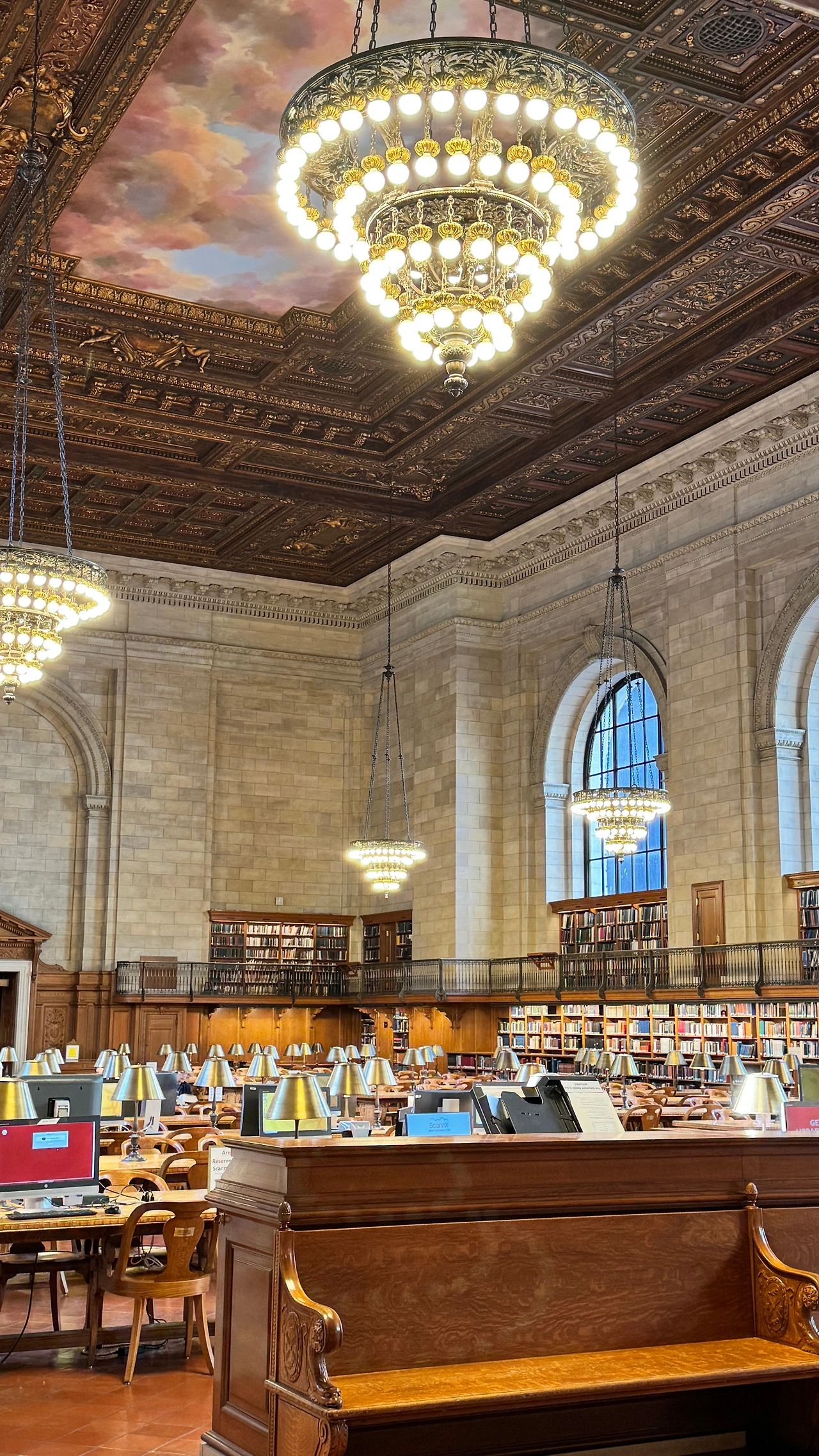 대리석 계단을 밟고 올라가 마주한 ‘로즈 메인 리딩 룸(Rose Main Reading Room)’은 압도적인 아름다움으로 시선을 사로잡습니다. 축구장만 한 크기의 광활한 홀, 높은 천장에 그려진 몽환적인 구름 벽화, 그리고 그 위로 쏟아지는 고풍스러운 샹들리에의 황금빛 조명. 수많은 책이 꽂힌 서가 아래서 묵묵히 책장을 넘기는 사람들의 모습은 그 자체로 하나의 성스러운 의식처럼 보입니다.