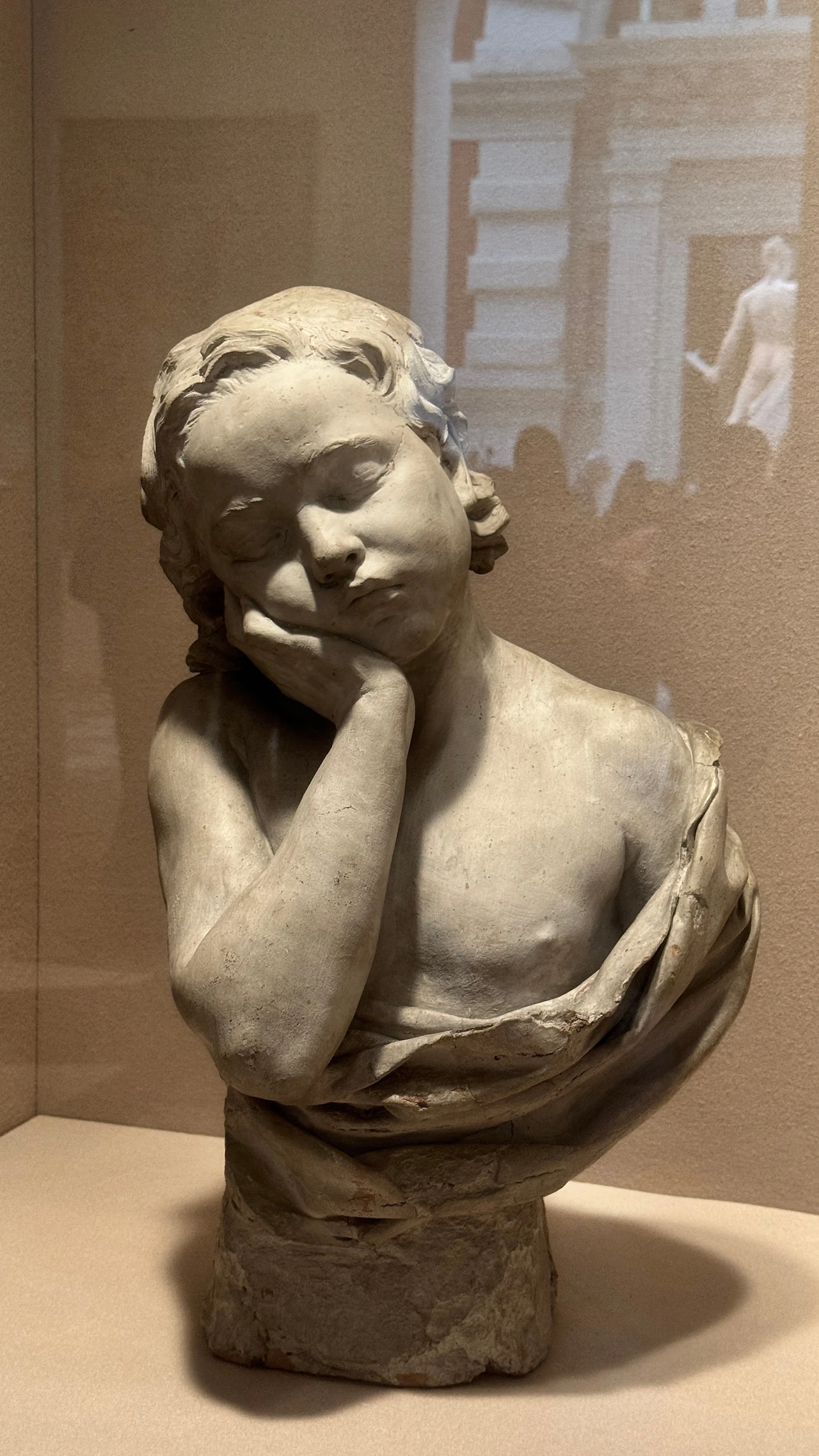 턱을 괴고 깊은 잠에 빠진 소년의 얼굴은 가만히 들여다보는 것만으로도 마음속에 쌓인 방어 기제들을 무너뜨립니다. 차가운 돌덩어리 속에서 어떻게 이토록 부드러운 살결과 규칙적인 숨소리를 건져 올릴 수 있었을까요. 소년의 눈꺼풀 아래에는 분명 우리가 잊고 지낸 가장 맑고 투명한 꿈들이 흐르고 있을 것입니다. 화려한 장식도, 복잡한 알레고리도 없지만 그 단순한 평화로움이 주는 경탄은 그 어떤 대작보다도 길게 제 가슴을 울렸습니다.