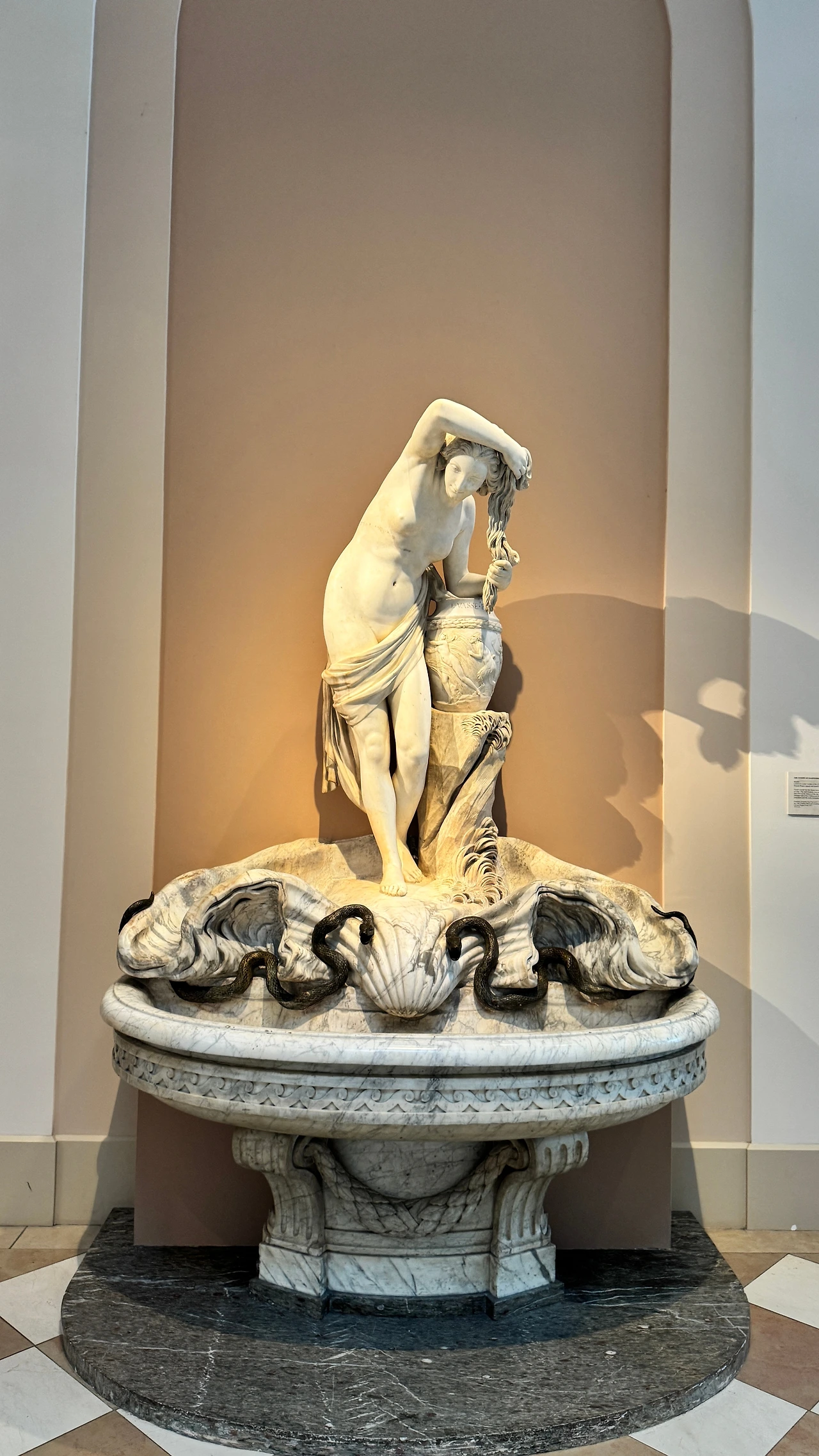 머리카락을 짜는 님프의 풍만한 여체와 부드러운 대리석의 질감에 매혹되어 홀린 듯 다가갔을 때, 저는 님프가 손을 얹은 항아리에 새겨진 사티로스의 거친 추격전과 분수 바닥에서 저를 노려보는 사실적인 청동 뱀들을 발견했습니다. 그것은 관람객인 저에게 건네는 서늘한 경고였습니다. "아름다움은 결코 함부로 범접할 수 있는 것이 아니며, 신성한 영역에는 그에 마땅한 수호자가 있다"는 선언처럼 느껴졌습니다. 님프의 평온함과 뱀들의 날카로움이 빚어내는 이 긴장감 넘치는 대조는, 예술이 우리에게 주는 경탄이 단순히 시각적인 즐거움에 그치는 것이 아니라 깊은 경외심(Awe)을 동반해야 함을 일깨워주었습니다.