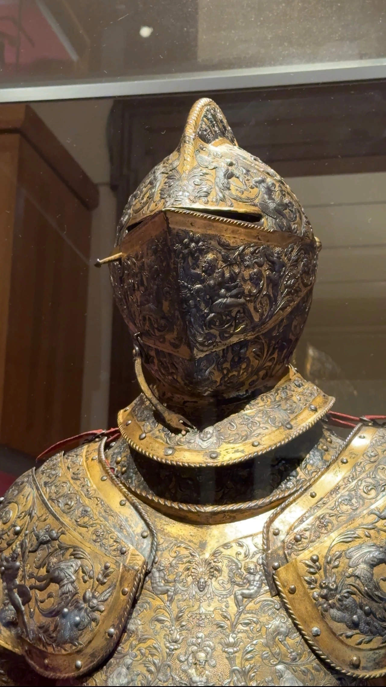실제 전투용이라기보다는 왕의 권위를 선포하기 위한 퍼레이드용으로 제작된 이 갑옷은, 강철이라는 거친 소재를 세밀한 은과 금으로 수놓은 정교한 캔버스로 바꾸어 놓았습니다. 갑옷 전체를 덮고 있는 아폴로와 다프네의 신화적 서사와 그로테스크한 문양들은 전쟁의 도구조차 예술의 경지로 끌어올리려 했던 당대 장인들의 치열한 예술혼을 증명하고 있었습니다. 수백 년의 시간을 견뎌온 차가운 금속 광택은 오늘 같은 빗속에서도 여전히 퇴색되지 않은 권위와 아름다움을 뿜어내며, 관람객인 저를 압도했습니다.