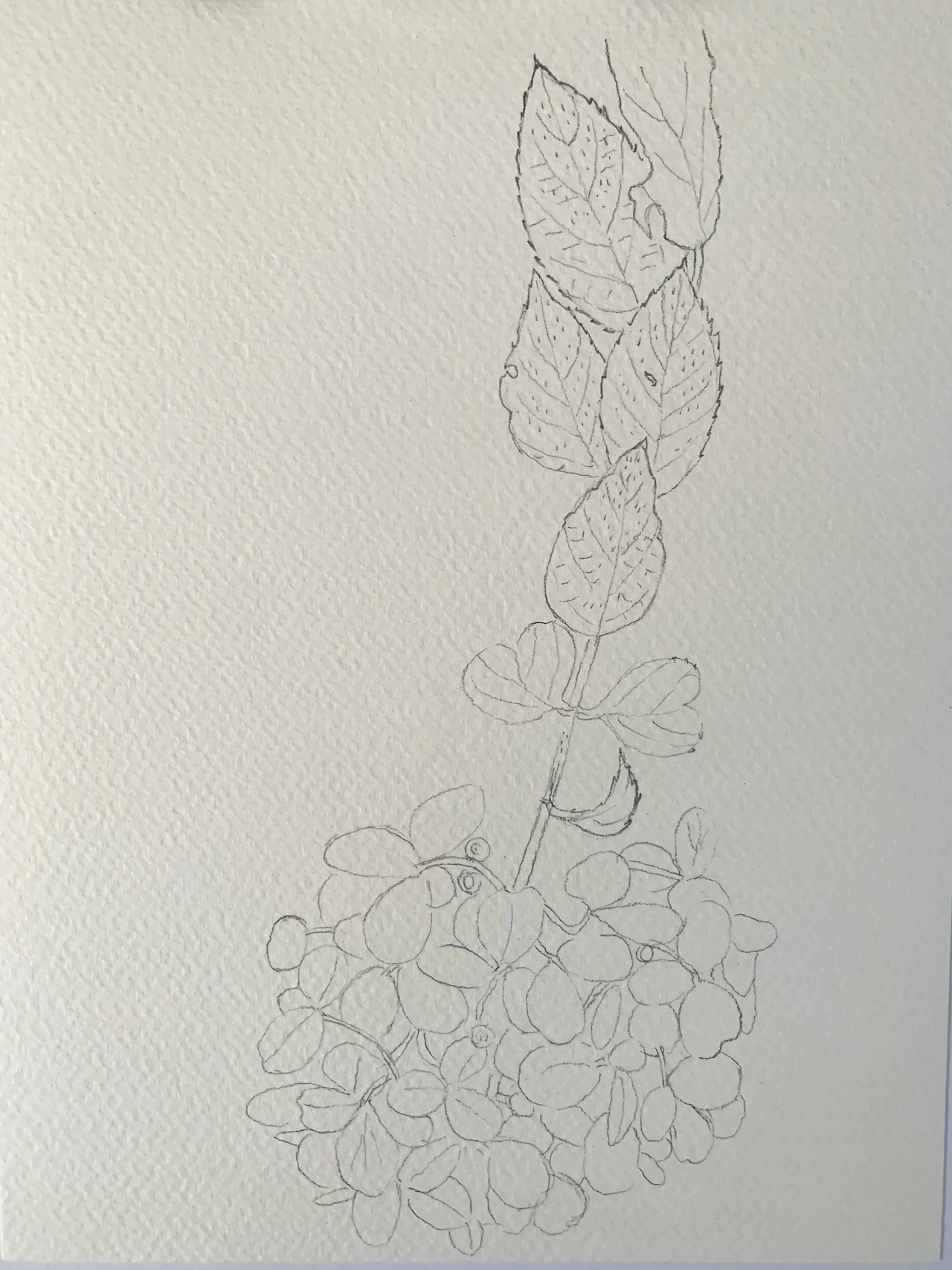 나무수국의 오묘한 빛깔. 자연의 색과 모양은 같은 대상이어도 하나하나 다 다르다. 아무리 같게 그리려고 애써 봐야 대상과 완성된 그림 사이에는 격차가 있다. 마음속에 내가 그린 식물을 꼭꼭 잘 심어둔다. 생명을 느끼고 덩달아 나도 살아난다. 내가 그린 식물이 이 세상 어딘가에 잘 있을 거라는 희망을 품는다.
