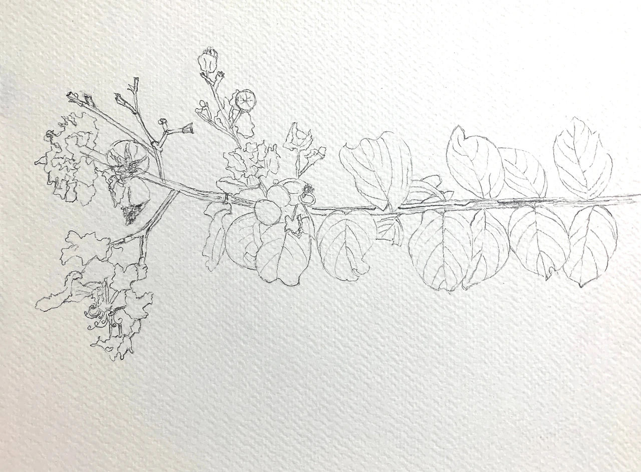 조례호수도서관 식물 그리기 수업을 하러 갈 때 늘 만나는 배롱 한 그루가 있었다. 가지가 낮게 길가 쪽으로 드리워져 꽃과 잎을 가까이서 볼 수 있었다. 9월까지는 꽃이 꽤 싱싱하게 피어있더니 10월 초가 되니 꽃은 거의 없고 열매가 달려있다. 비슷비슷한 크기로 둥글었던 잎 모양은 제각각 달라졌고 잎 크기도 작아졌다. 두께도 얇아진 듯하다. 찢어져 나간 잎도 여러 장 보인다. 한 여름 동안 붙들며 버텼던 힘을 훌 빼는 느낌이다. 여름을 지나, 나무 꼭대기 쪽 가지 끝에만 꽃을 달고 있는 배롱이 홀가분해 보인다.