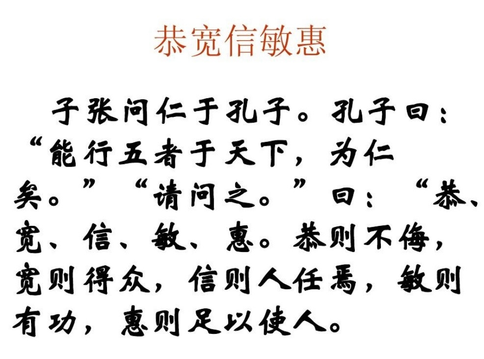 자장(子张)이라는 제자가 공자에게 인(仁)에 대해 묻자, 공자는 다섯 가지를 행하면 인(仁)이 이루어진다고 하였다. 그것은 ‘공관신민혜’이며, 공즉불모(공손하면 수치를 당하지 않고), 관즉득중(관대하면 많은 사람을 얻고), 신즉인임언(믿음을 얻으면 남이 일을 맡기고), 민즉유공(민첩하면 공을 세울 수 있고), 혜즉족이사인(은혜를 베풀면 족히 사람을 부리게 된다)이다. 각 앞글자에서 ‘공관신민혜’가 나온다.