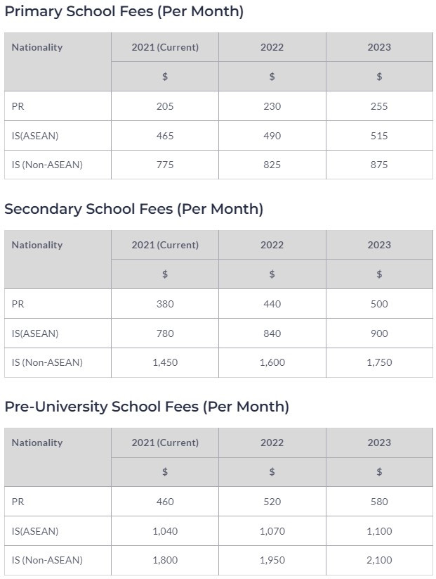 초등학교의 경우, 싱가포르 사람은 무료, 영주권자는 25만5천원, 동남아 사람은 51만5천원, 그외 사람은 87만5천원을 내야한다. 이 가격은 1달 기준이므로, 앞의 세가지에 해당하지 않는 순수 외국인인 나의 경우 현지학교를 보내면 일년에 약 1천만원의 학비를 내야 한다.