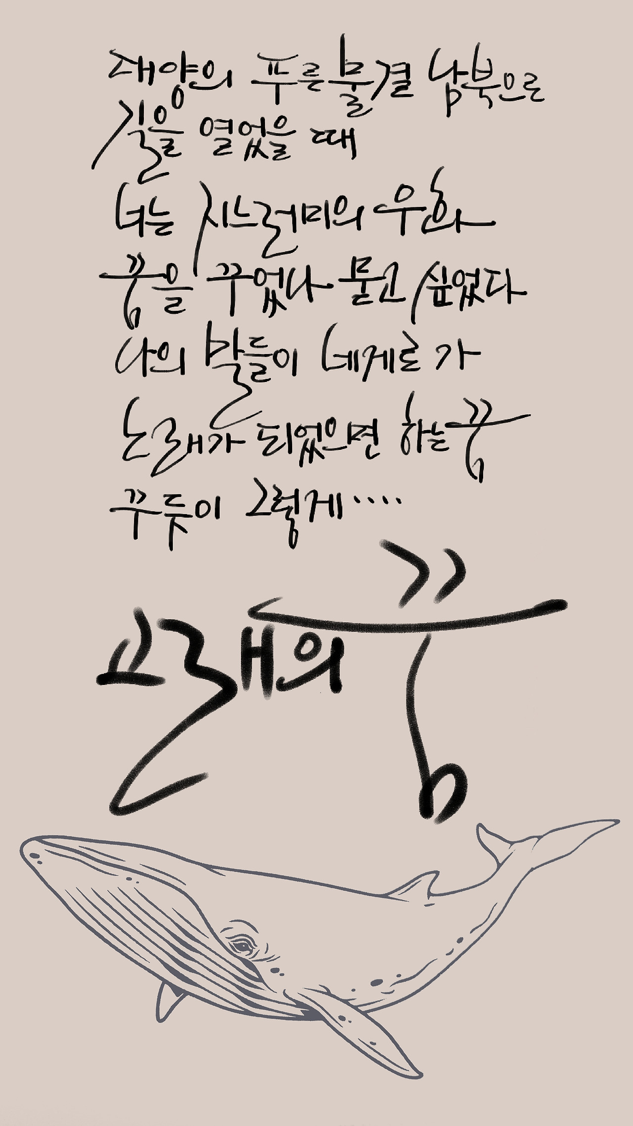 네 발의 들짐승이 꼬리를 감추고 발톱을 뽑았다. 날카로운 송곳니는 물고기의 그것처럼 자취를 감추었고, 몸뚱이를 감쌌던 들짐승의 터럭은 어디로 갔는지 물비늘 덮어쓰고 달빛에 반짝였다. 대양의 검푸른 바다에는 남과 북으로 이어진 길 하나 있었고, 극지의 끝에는 달이 떴고 해가 떴다. 과거에서 날아든 별빛과 오늘의 볕이 뒤엉켜 춤을 추었다. 빙하가 달처럼 떠도는 바다에 고래 한 마리 고개 내밀어 별을 보았고, 오로라의 몽환에 빠져들었다. 죽어버린 별의 꿈과 살아 꿈틀 거리는 바다가 유빙처럼 떠돌았다. 고래가 졸고 있었다.