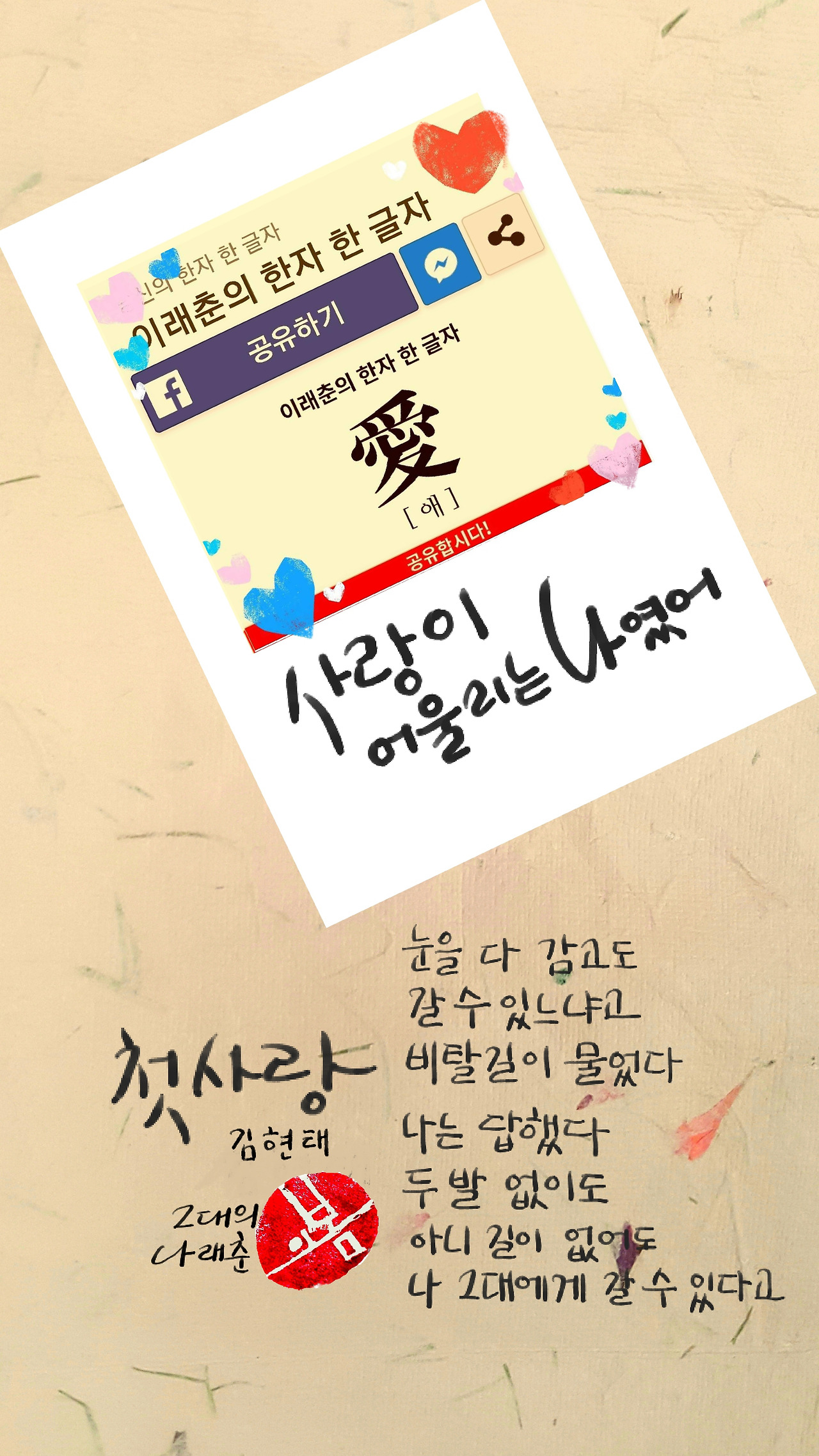 심심풀이 땅콩으로 잔 재미를 주는 페북의 '봉봉이'가 당신을 표현하는 한 자의 한자(漢字)를 알려준다 해서 이름을 적어넣었다. 이래춘 세 자 이름을 적고서 잠시 기다리니 이런 글자를 내놨다. 사랑 애(愛).