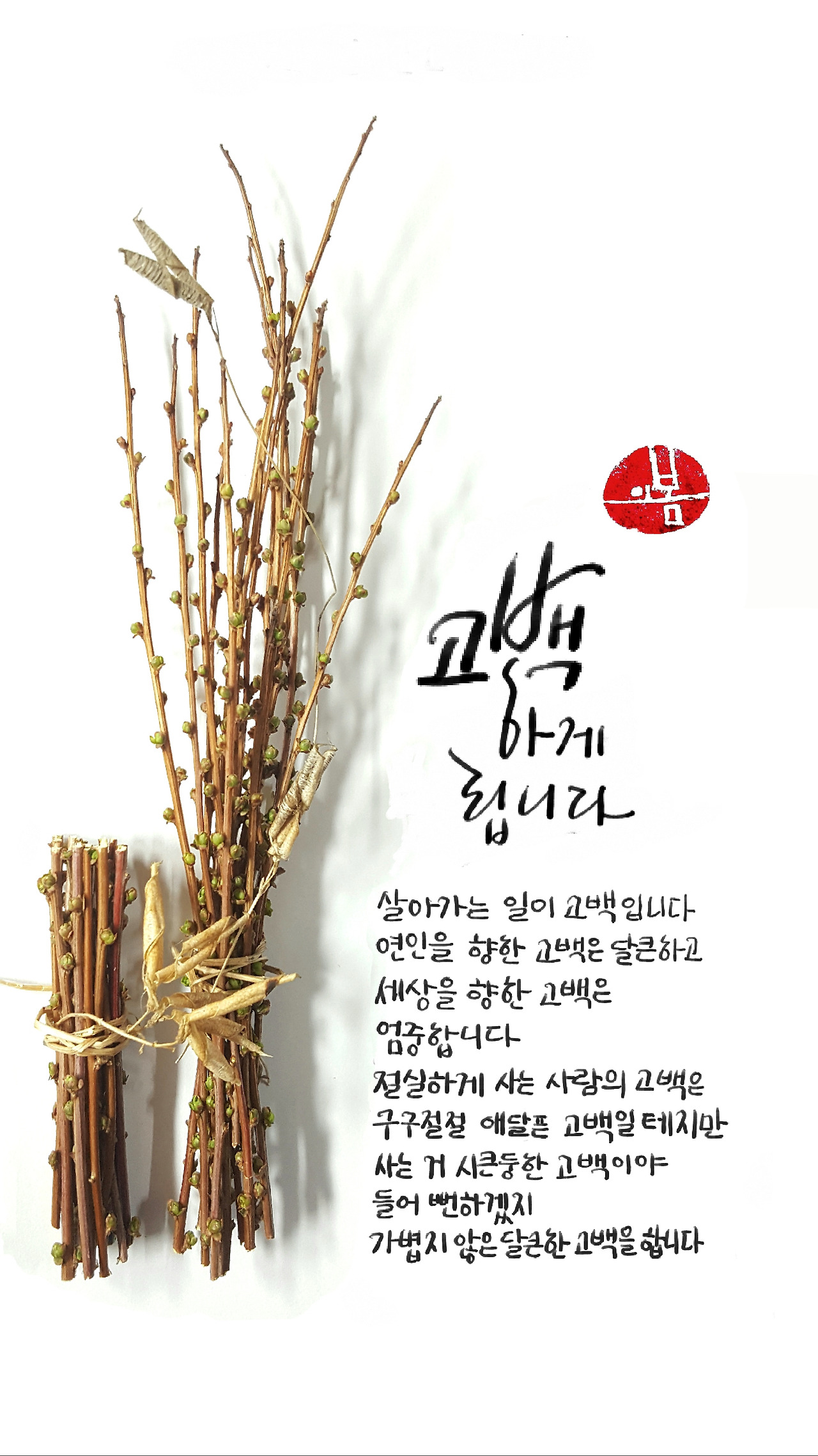 어떻게 사는지? 여전히 나를 사랑하는지? 궁금한 마음은 굴뚝 같은데 차마 물을 수 없는 자신이 처량해서 마음만 애달픈 시였다 할까요. 잘린 조팝나무 가지와 짧은 싯구가 남의 일 같지 않았습니다.