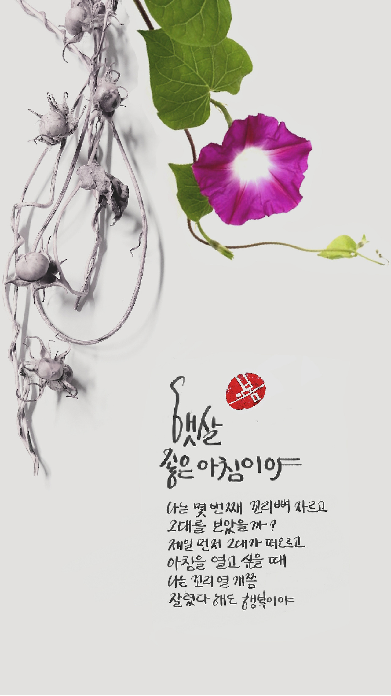 나는 새벽마다 나팔꽃으로 피고, 너는 쌔근쌔근 잠자면 좋아. 기지개 곱게 켜고 일어나
