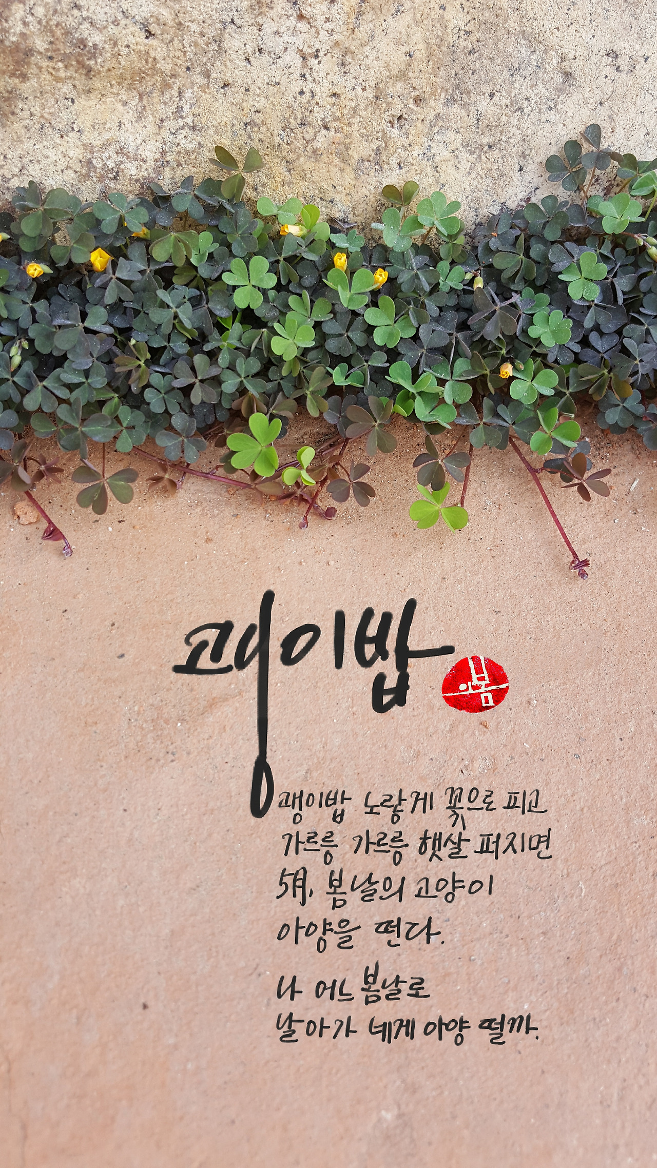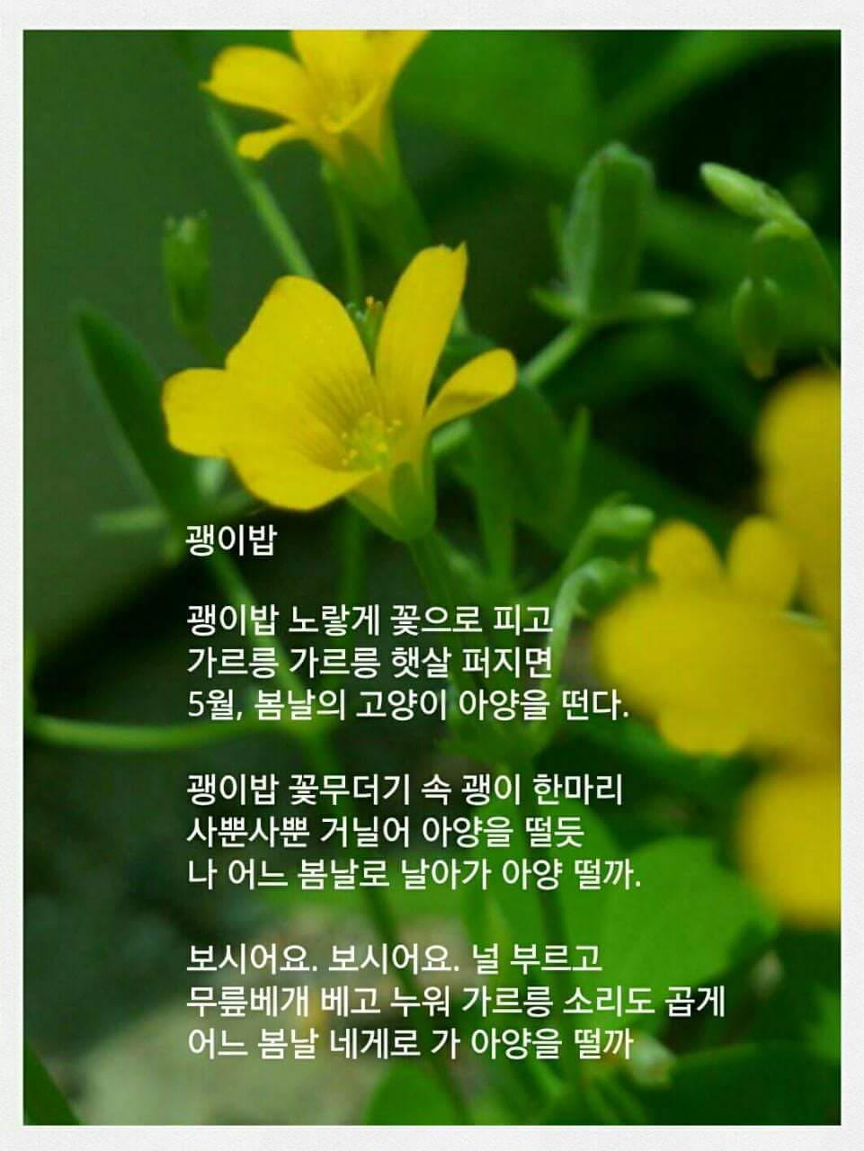 변하지 않아서 좋은 것은 이런 소소한 감정일 거야. 지난 해에도 난 괭이밥 노랗게 피운 꽃송이에 마음을 빼앗겨 사진을 찍었고, 사랑하는 마음 주저하지 않고 이렇게 노래를 했어. 그 마음이 올해에도 변하지 않아서 황토벽 갈라진 틈바구니에 떼지어 자라난 괭이밥을 보고는 망설임도 없이 사진을 찍고는 한참을 쪼그려앉아 바라보았어. 하트 세 개 잎줄기에 매달려 초록으로 설레고, 노란 꽃송이 앙증맞게 별처럼 피었지. 초록의 봄밤에 노란 꽃불로 괭이밥이 타닥이던 날에 지난 해에도, 올해에도 나는 변함없이 울렁이는 가슴 진정시키기에 바빴어.