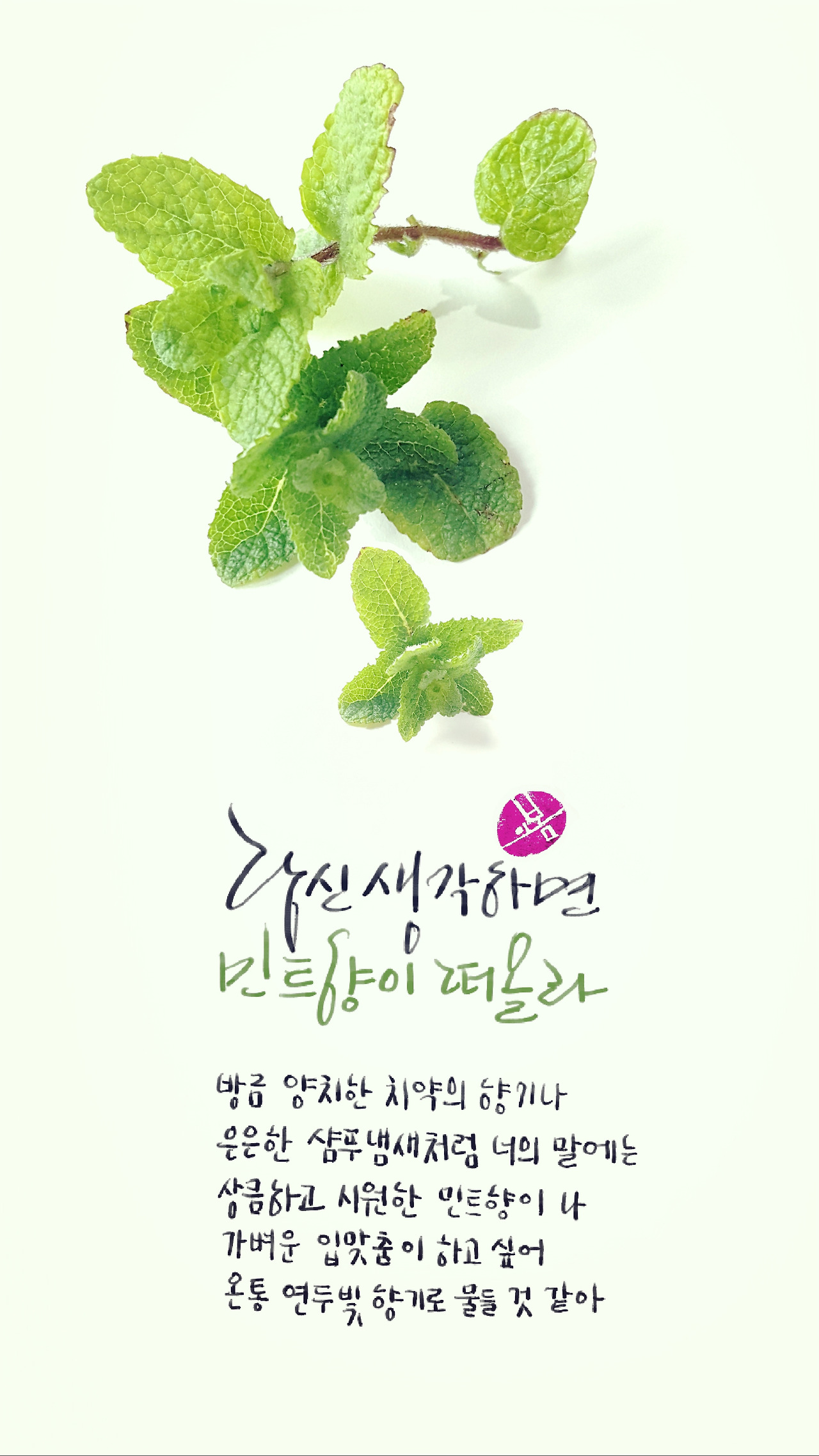 말에서 박하향 풍기는 사람이 세상에 몇이나 되겠어요. 향기로운 당신과 나, 아침의 대화를 남기고 싶었지요. 모르겠어요. 다만, 오늘의 기억은 그랬어요. 상큼시원한 당신이 좋아서 초록으로 향기로운 민트 하나 남기려 해요. 향기로와 행복한 대화였어요. 당신하고의 오늘은....