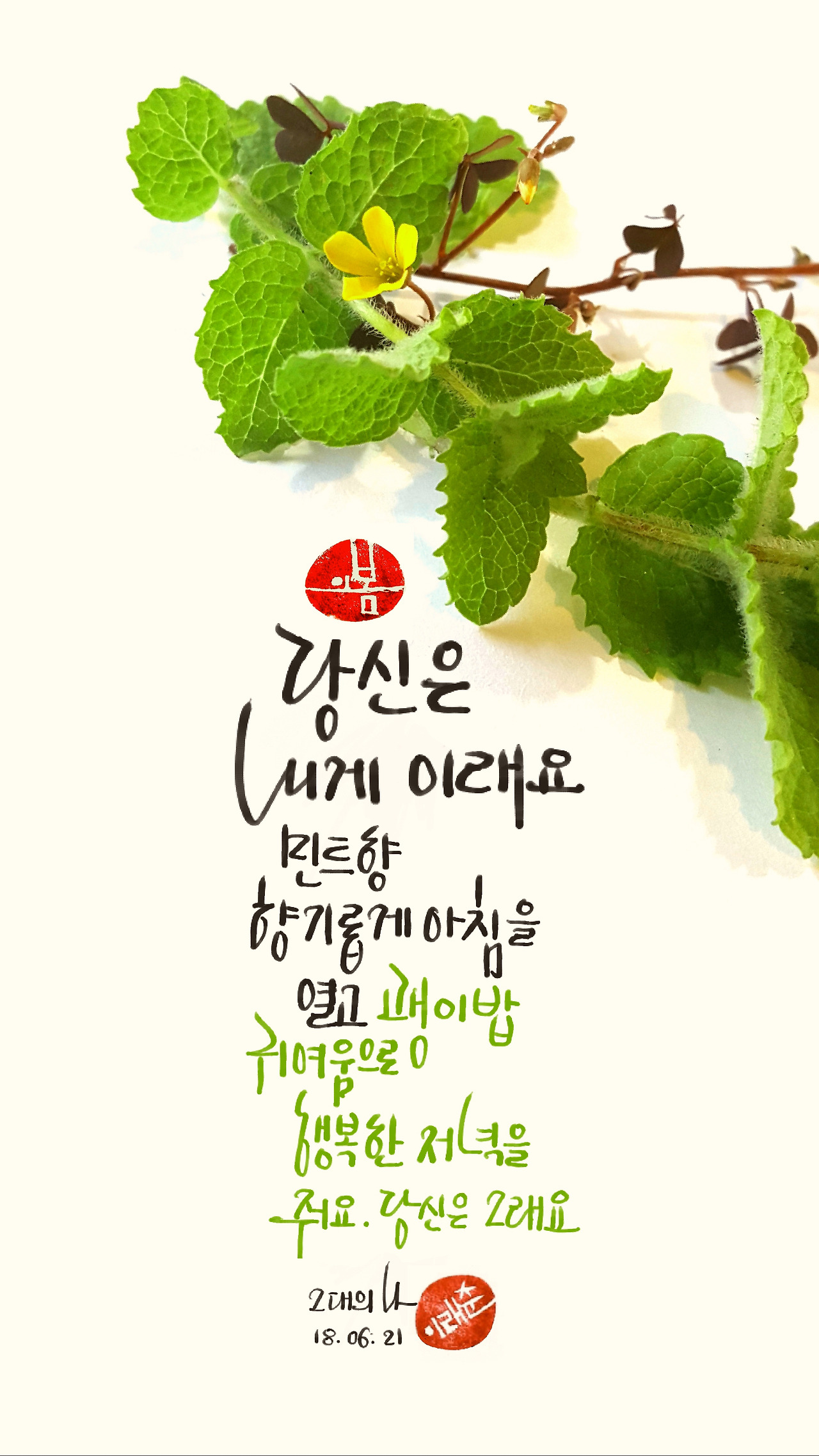 라면 한 그릇과 참치김밥 한 줄 앞에 놓고서 '있잖아, 난 니가 정말 좋아. 사랑해!' 고백의 말을 남기고는 어쩐지 쑥쓰러워 화장실로 달아나는 청춘의 고백입니다. 그래서 때로 얼굴 빨개지는 나라지만 어쩔 수가 없어요. 아침에 눈을 뜨면 당신이 떠오릅니다. 알람에 저장된 당신이라도 된듯 눈을 뜨면 머리며 가슴을 자연스레 채우고 말지요. 당신의 미소와 웃음소리가 심장을 뛰게하고, 살냄새 은은하게 가슴을 채워 향기롭습니다. 당신은 그렇습니다. 괭이밥 노란꽃 한송이와 초록민트로 당신의 아침을, 하루를 깨우고 싶었다지만 결국 당신이 내게 그런 사람입니다. 향기로 열고 웃음으로 닫는 하루가 당신입니다.