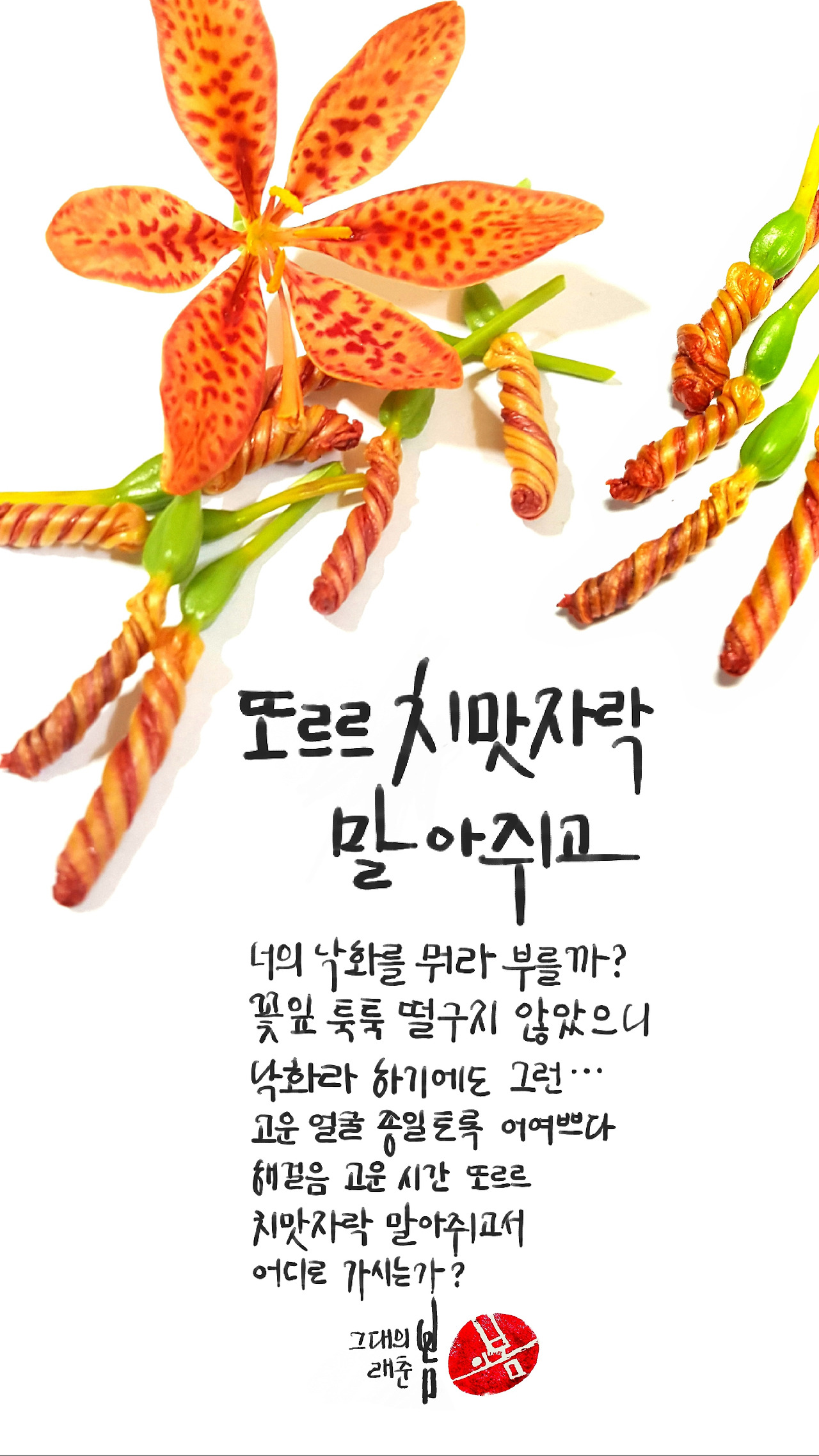 시원한 벚나무 그늘에서 시간죽이기를 하다 꽃 하나 만났다. 이름도 범상치 않은 범부채란다. 이파리는 얇고 두텁게 길게 뻗어서 마치 부채를 닮았고, 꽃잎은 주황의 몸통에 표범처럼 얼룩무늬 있다고 해서 범부채라고 하는데, 녀석의 이름 알고 보니 영낙없는 범부채가 맞다. 꽃은 여섯 잎 귀여웠다만 꽃을 얘기하려는 건 아니다. 오히려 종일 어여뻤던 꽃잎 해질녁이면 또르르 말아 쥔 녀석의 뒷모습이 좋았다. 피었으니 지는 건 당연한 일인데 지는 낙화의 처절함이 찬란한 봄날을 지우고야 마는 꽃들이 어디 한 둘이랴. 툭툭뚝뚝 떠나는 뒷모습이 또 다른 꽃으로 피면 얼마나 좋을까?
