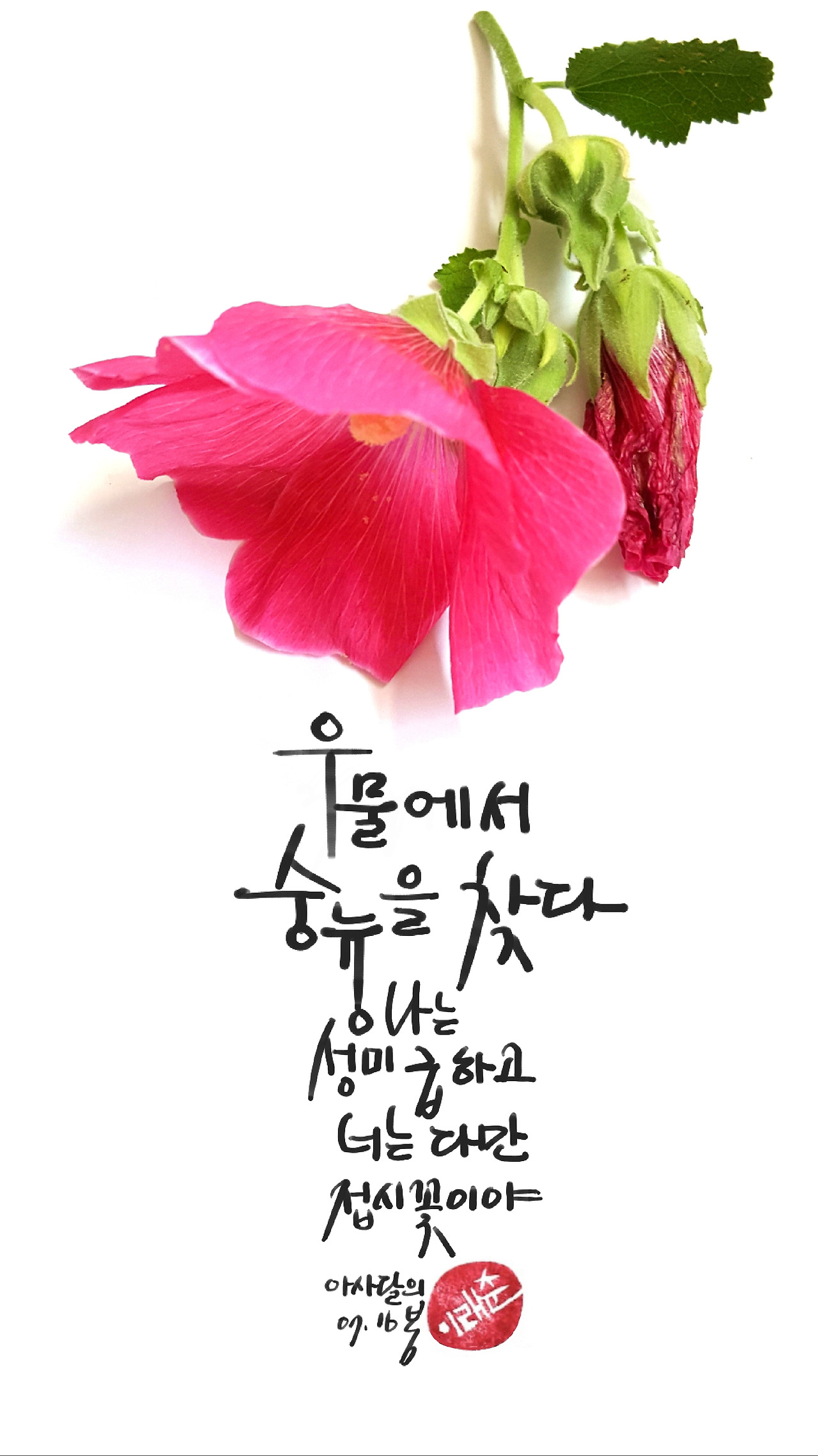 그렇지만 나는 기다리지 못했다. 조바심이다. 굳이 오늘 봉숭아꽃물을 들여야할 이유는 없었다. 없는 꽃을 탓하며 어뚱한 짓을 할 이유는 더더욱 없었는데도 나는 기다리지 못했다. 뭐가 급했을까? 조바심을 내야하는 이유는 몰랐지만 굳이 오늘이고 싶었다. 봉숭아 어린 싹을 뜯고 마당에 탐스런 접시꽃을 땄다. 붉게 핀 접시꽃이라면 봉숭아처럼 곱고 예쁜 손톱달을 만들 것만 같았다.