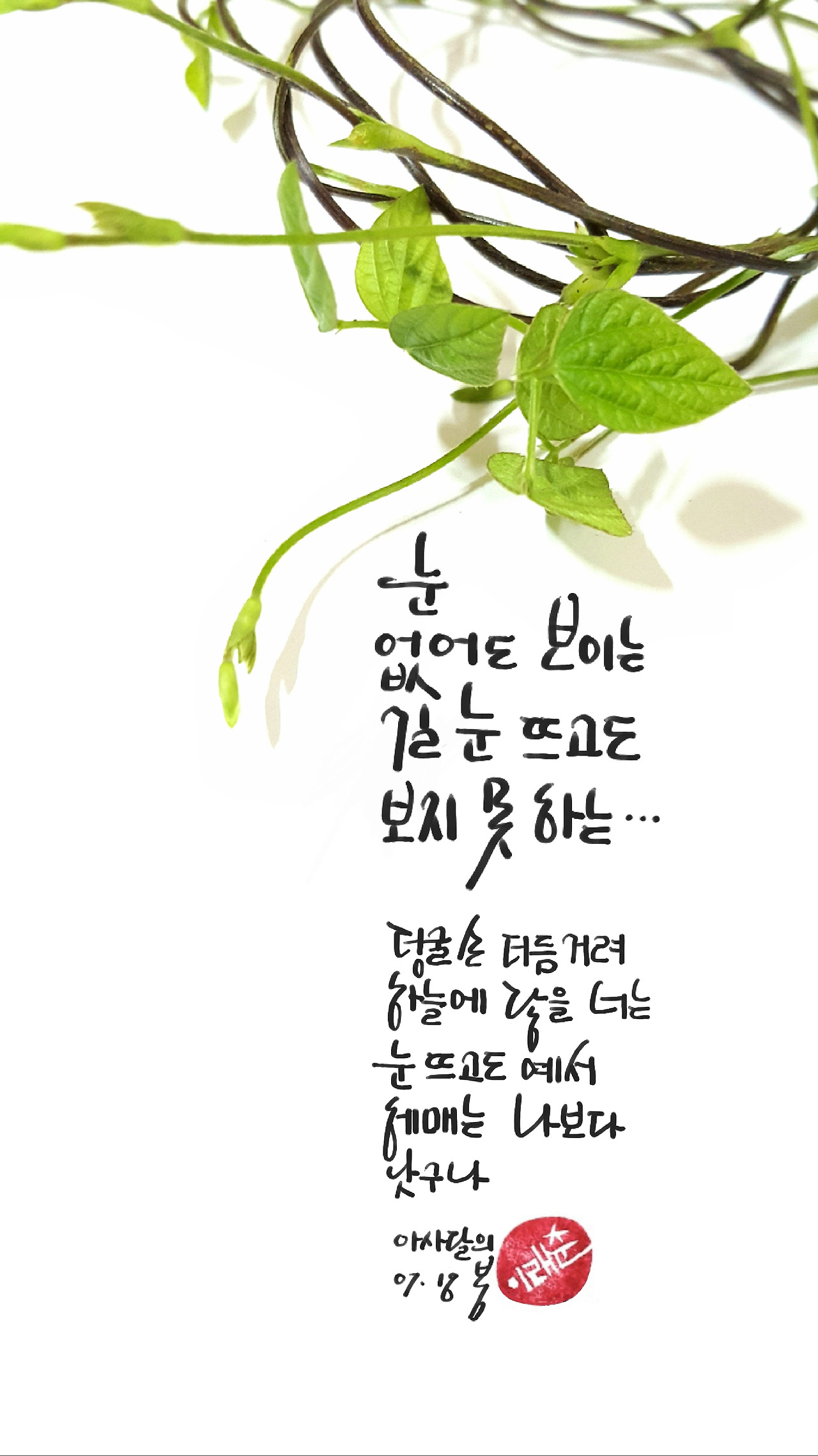 알 수가 없다. 양날의 칼 손에 쥐고서 나는 걸음을 멈췄다. 새콩 줄기손 더듬더듬 허공을 더듬어 나뭇가지를 붙들고, 참취나물 튼실한 줄기를 붙들어 하늘을 기어올랐다. 새콩은 나뭇가지를 기대어 단단히 줄기를 꼬고 올라야만 했다. 햇살 한 줌 걸린 나무 꼭대기에 기어올라야만 자주빛 꽃송이 주렁주렁 피워내고, 콩꼬투리를 맺을 거라서 새콩 줄기가 꼬이는 건 세대를 잇는 몸부림이기도 했다. 너는 꼬여 삶의 절정을 맞을 거였다. 꼬여 좋거나, 꼬여 괴롭거나 여름의 열기 머리에 이고 땀방울을 흘렸다.