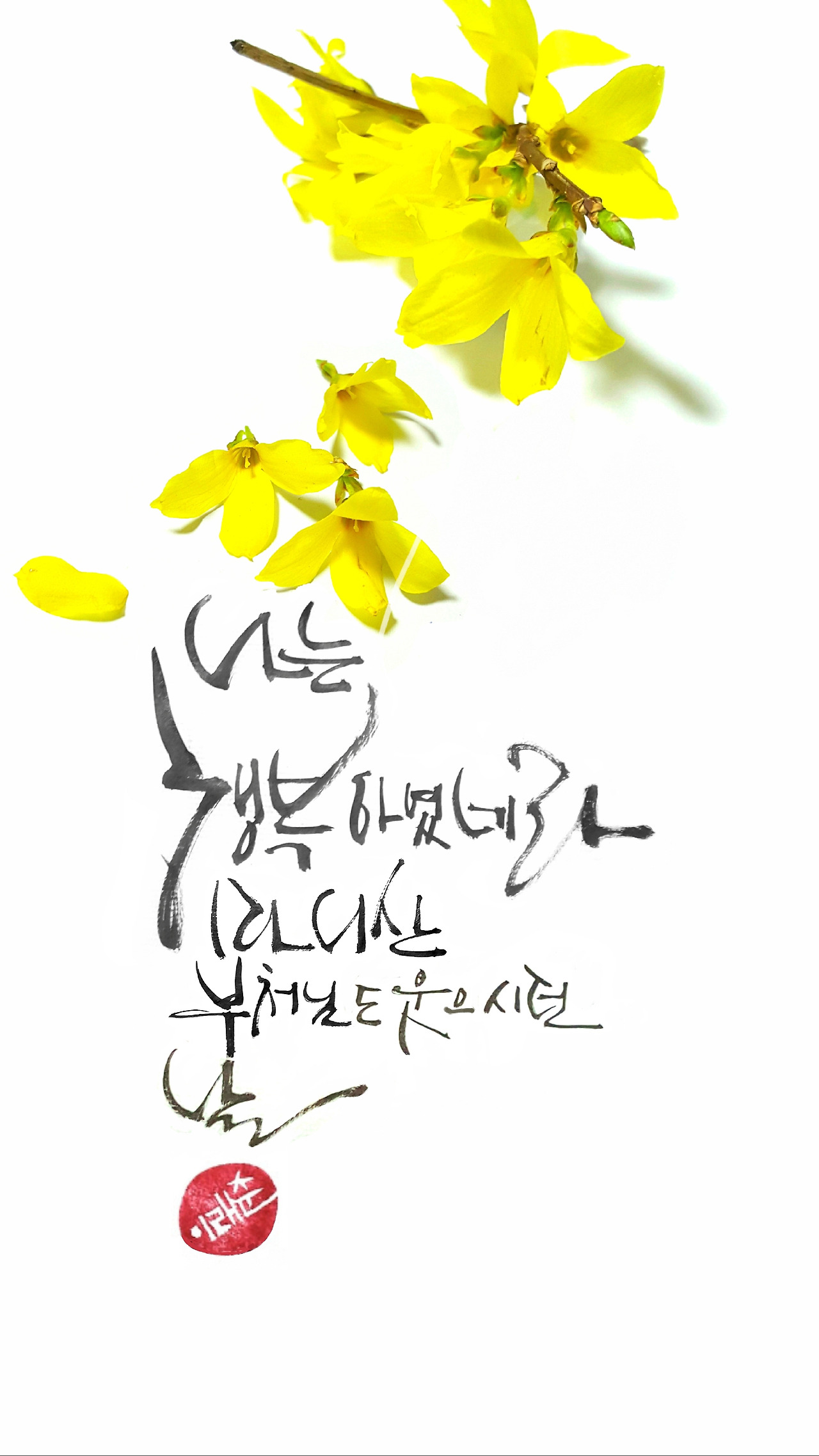 개나리꽃을 사진으로 남겼습니다. 이어 잊힐까 아쉬운 마음에 붓을 들었습니다. 취하고 취한 몸뚱이라서 마음도 뛰놀고, 제 알아 붓도 뛰놀았습니다. 어차피 한석봉 정갈한 명필도 아니고, 김정희의 시대를 앞선 그라피티도 없으니 그저 휘적여도 좋은 글씨가 휘청였지요. 아, 대가들의 이름을 불러 어깨를 견주려는 것은 아닙니다. 글씨, 캘리그라피.... 이런 생각이 떠오르니 그저 머릿속에 동동 떠오르는 이름이었겠죠. 샛길로 이야기가 빠질지도 모르겠습니다. 뭐 그렇다고 난리야 나겠어요. 글씨 하나 끄적였습니다.