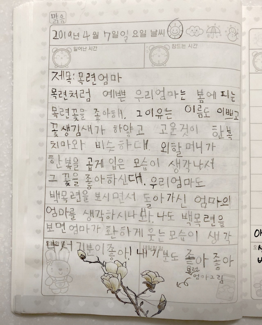 '목련처럼 예쁜 엄마가 그의 어미를 생각하나 봐요' 나도 하얀 목련꽃을 보면 엄마가 생각나서 기분이 좋아요.