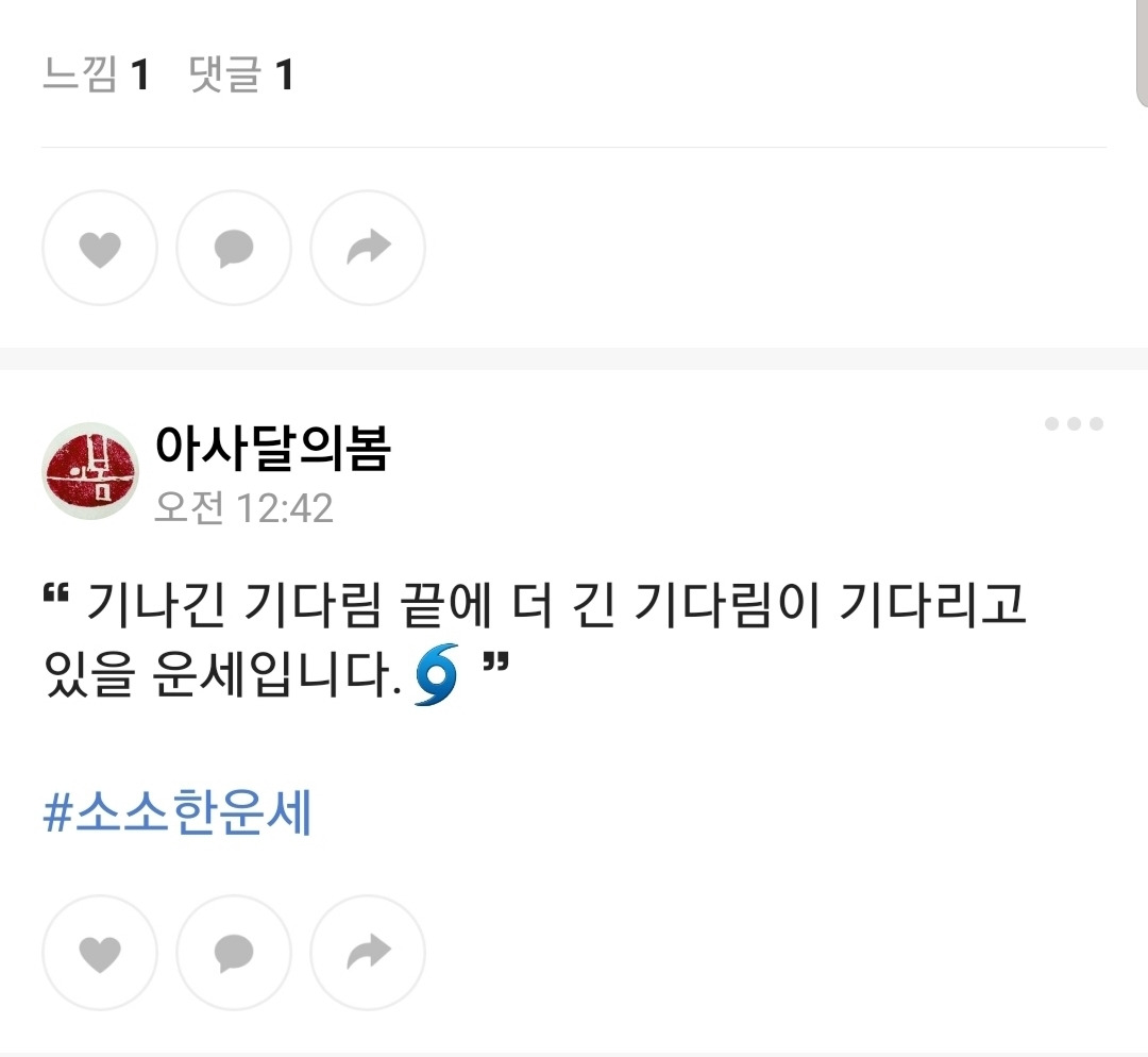 그저 하는 말입니다. 신 내린 무당의 점꾀도 믿지 않는 나인데 그깟 sns의 소소한 운세 따위를 믿겠냐만, 지친 시간에 읽는 재미가 있었습니다. 자정을 넘기는 시간이면 늘 카카오스토리가 주는 운세의 재롱을 반겼습니다. 근데, 어제는 그러군요.