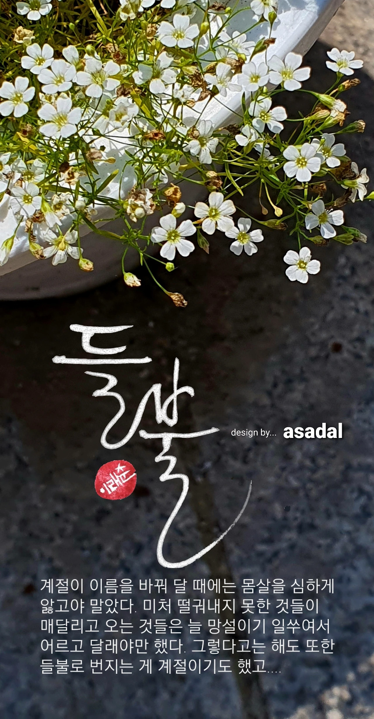 잡힐 듯 말 듯 장난을 치기도 하고, 때로는 싫다며 방바닥에 벌렁 누워 발버둥도 쳤다. 생각지도 못했던 아기의 반응에 당황하는 건 오히려 엄마였다. 계절이라고 다를 것도 없었다. 커다란 종이에 숫자 몇 개를 적어놓고는 여기까지는 겨울이고, 여기부터는 그러니까 봄인 거야. 아무리 선을 긋고 옷을 갈아입히려고 해도 호락호락 물러설 계절은 없었다. 때가 되면 알아서 물러나고, 다가올 것을 조바심으로 화를 돋우는 건 무모했고, 어리석었다. 어디에든 퇴로는 필요했고 그만큼의 시간도 줘야만 했다. 성미 급한 녀석들은 알아서 양지바른 곳에 자리를 잡았다. 반대로 거북이가 가슴을 치며 답답해 죽을 것만 같은 느림보도 있었다. 몇 달을 눌러앉아 정이 들었던 녀석은 미련이 붙들고 엉덩짝을 놓아주지 않아 머물기도 했다. 종일 가봐야 노루꼬리만 한 햇살이 잠깐 어른거리다 마는 골짜기엔 본진을 놓친 패잔병들이 득실득실 모여있었다. 엄동설한이 따로 없었다. 그렇지만 결국은 밀려드는 꽃 무더기에 밀려 자리를 내줘야만 했고, 모르지도 않았다. 허세라도 부려야만 퇴로를 열 수 있었고, 물러날 시간을 벌 수 있었다. 헐겁게 묶인 시간이 제멋대로 움직인다고 입을 네댓 발 빼문다고 해서 해결될 일도 아니었다. 양지바른 언덕에 노란 복수초가 꽃망울을 터트리기 시작하면 겨울은 짐을 꾸리기 시작했다. 제법 먼 길을 가야 했으므로 그만큼 짐도 많아서 한 날 한 시에 모두 떠나기를 바라는 건 욕심이었다.