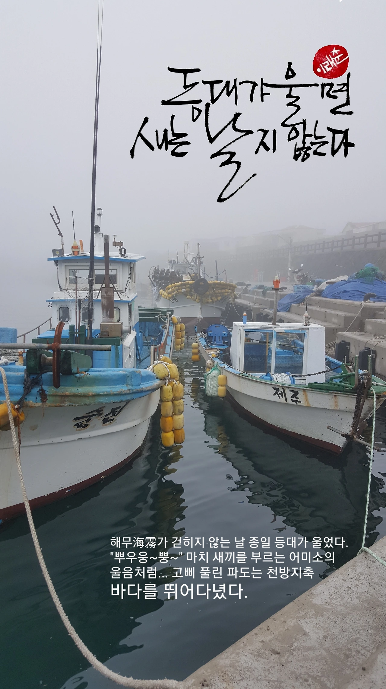 일정한 간격을 두고 우는 소리는 새끼를 찾는 어미소의 울음처럼 들렸다. 젖을 떼지 못한 송아지야 너른 바다를 천방지축 뛰고 있을 터였다. 마라도와 가파도 사이의 좁다란 물길은 안개처럼 고요했고, 이따금 철썩대던 파도만이 바다임을 이야기했다. 사나운 물살은 온 데 간데없었다. 아우성치던 파도며 귀 따갑게 울던 갈매기도 입을 다문 시간엔 오직 등대만 서럽게 울었다.
