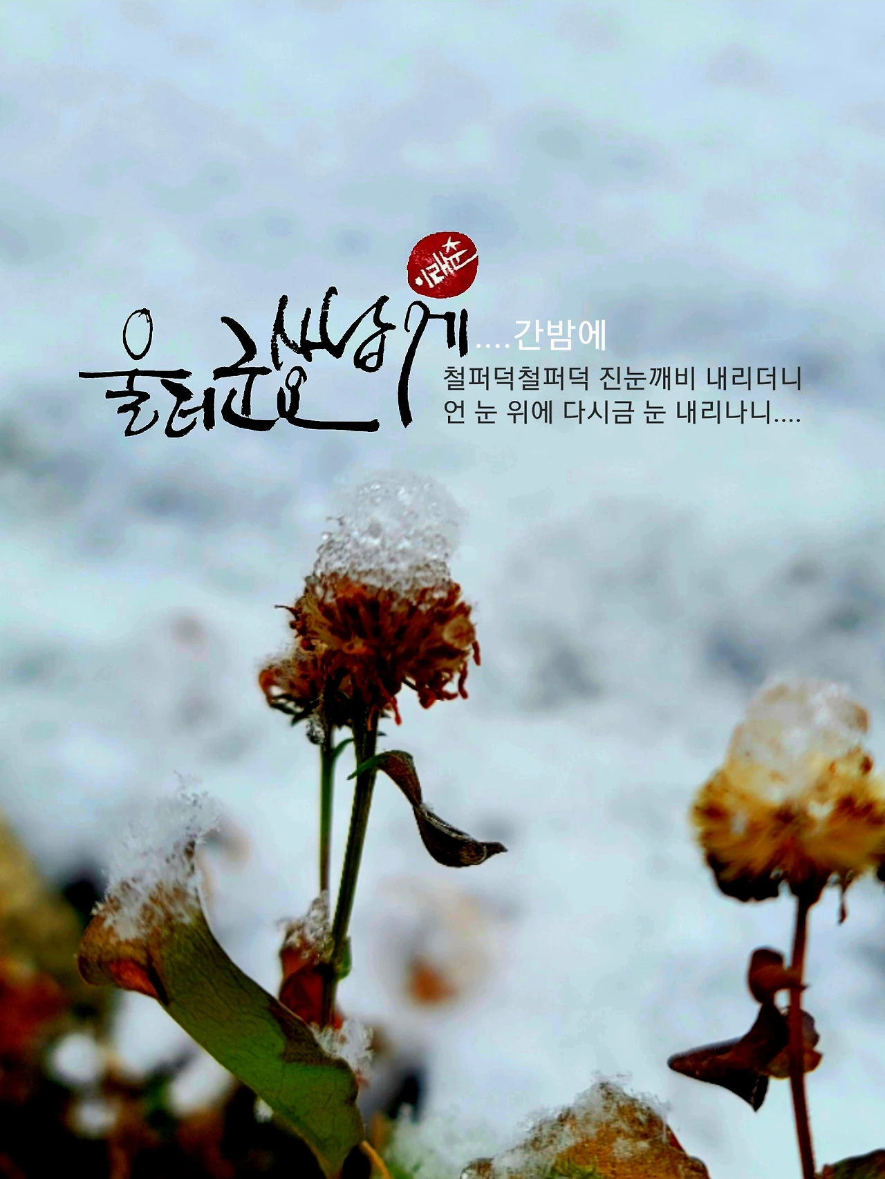 물으면 대답해주세요. 청하면 한 번쯤은 걸음 해 주세요. 부르지도 않은 날에 무슨 억하심정 있다고 불청객으로 오시는지 얄궂습니다. 철퍼덕 요란스레 떨어진 눈이 채 녹기도 전에 언 눈 위로 다시 눈이 내립니다. 한 번 들러붙은 눈은 빗자루에도 쓸리지 않고 진드기처럼 매달렸습니다. 끈적끈적 질척대는 꼴이 사납습니다.