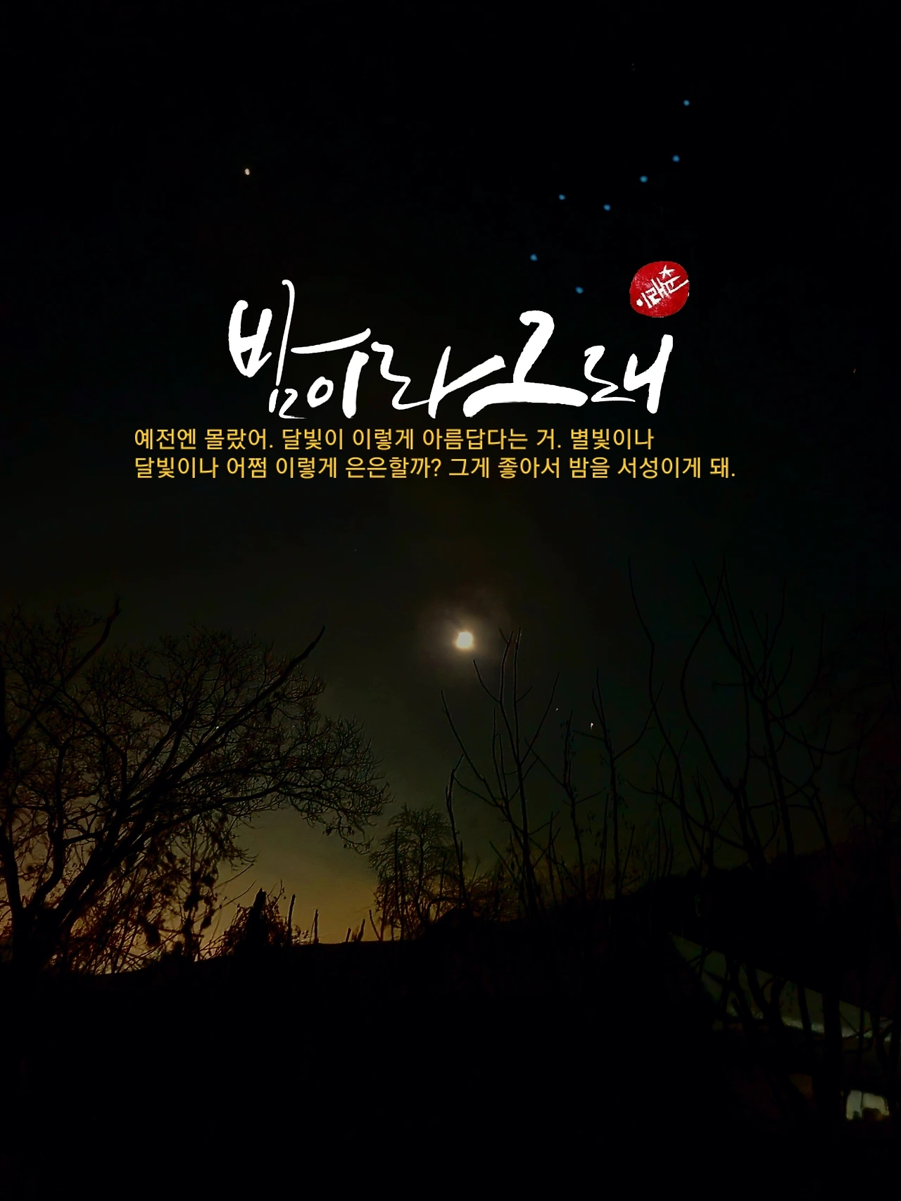 담배 한 개비 피워 물고서 달구경에 온통 마음을 빼앗기는 날이 늘었다. 바람 불면 별들이 찰랑찰랑 흔들렸고 별들 부딪히는 소리가 투명하게 울렸다. 은은한 달빛과 어슴프레 젖은 하늘이 어찌나 고운지 형용할 수가 없었다. 바라봄이 좋아서 뺨을 할퀴는 겨울바람은 별것도 아니었다. 무시해도 좋은 바람이 겁먹은 똥개처럼 짖었지만 이미 마음은 달에 가 있었다.