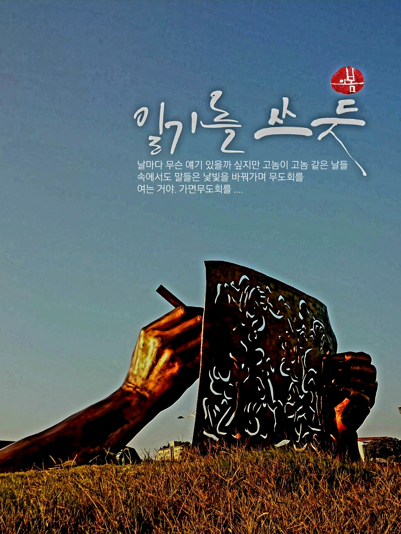 일기처럼 날마다 글 하나씩 써야지' 했던 다짐은 꽤나 길게 이어지고 있어. 지난해에 마음먹은 일이니 벌써 해를 넘겼어. 오늘이 겨우 해가 바뀌고 이틀째 날인데 모르는 사람이야 엄청 오랜 시간이 지난 거 같은 착각을 다 불러일으키고 나쁘지 않아.